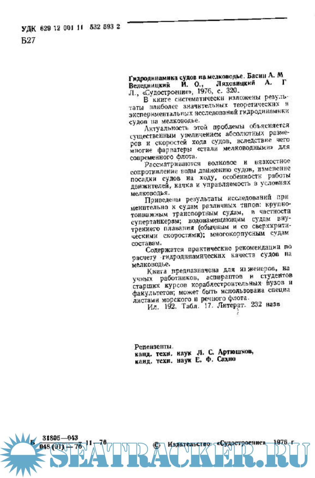 Год выпуска: 1976 Язык: русский Автор: А. Басин, И. Веледницкий, А. Ляховицкий Жанр: Учебное пособие Издательство: Судостроение Формат: PDF Качество: Отсканированные страницы Количество страниц: 159 Описание: В книге систематически изложены результаты наиболее значительных теоретических и экспериментальных исследований гидродинамики судов на мелководье. Рассматриваются волновое и вязкостное сопротивление воды движению судов, изменение посадки судов на ходу, особенности работы движителей, качка и управляемость в условиях мелководья. Содержатся практические рекомендации по расчету гидродинамических качеств судов на мелководье.