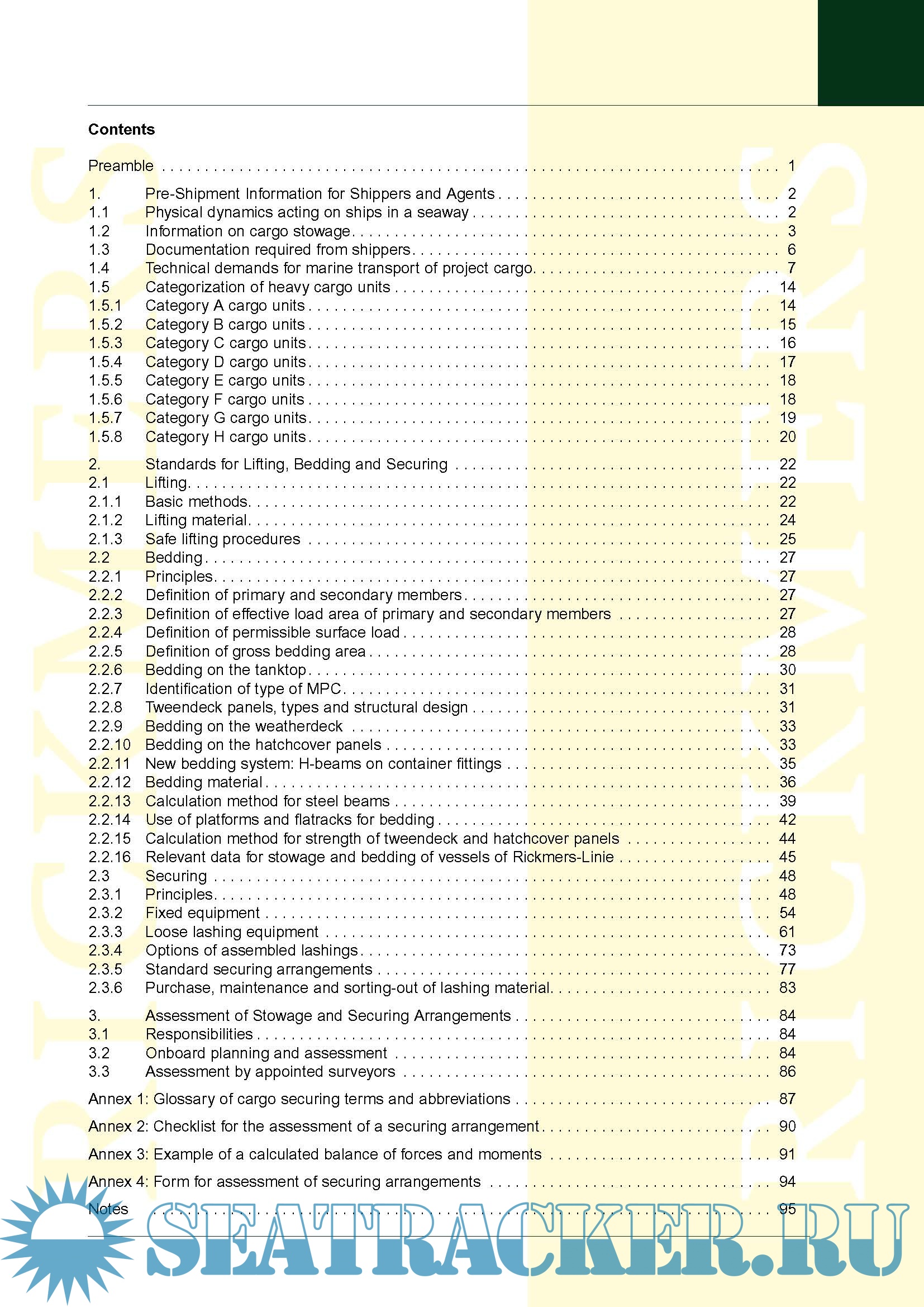 Year: 2009 Language: english Author: Rickmers-Linie GmbH & Cie. KG (Hamburg) Genre: Guide Publisher: Rickmers-Linie GmbH & Cie. KG (Hamburg) Edition: 4th Format: PDF Quality: eBook Pages count: 102 Description: This Rickmers Standard is considered the main reference for planning, handling, stowage and securing/lashing of project cargo in general. It applies to all vessels chartered and/or owned by Rickmers-Linie. The spirit and purpose of this Standard is to inform shippers of cargo units, stevedores and supercargoes etc. about cargo handling and securing practices on board of the vessels sailing for Rickmers-Linie and to provide a specific update to masters and officers. Realizing that safety requirements do not necessarily contradict commercial aspects, the main objective of Rickmers-Linie is to increase the technical and commercial performance of marine transport by avoiding damage and loss of cargo, finally resulting in an improved safety at sea and protection of the marine environment. The Standard, in particular, provides detailed information about lifting, bedding and securing/lashing of cargo as well as the equipment used and its maintenance. The Standard further describes the cargo information to be supplied by shippers in accordance with Chapter VI, Regulation 2 of the SOLAS-Convention (see Ch 1.3) and the necessary configuration of lifting provisions, bedding areas and securing points. The desired securing point configuration and lashing scheme of the cargo corresponds with the tensile strength (MSL as per IMO) of the fixed and loose securing gear on board of the vessels and their deck lay-out. Additional info: New 2009 Edition revised and updated by Peter van den Berg (Rickmers-Linie) in November 2009