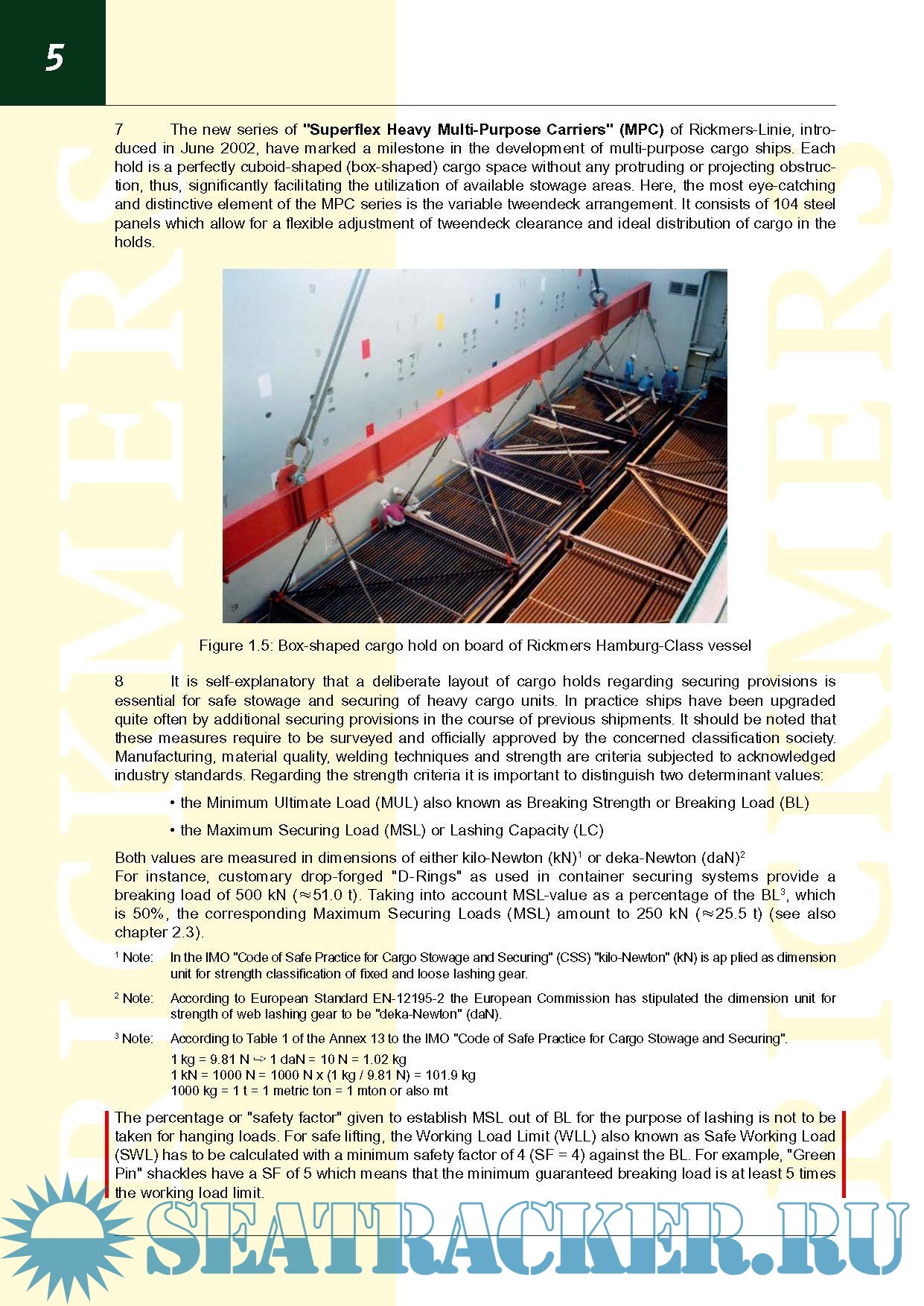 The Standard further describes the cargo information to be supplied by shippers in accordance with Chapter VI, Regulation 2 of the SOLAS-Convention (see Ch 1.3) and the necessary configuration of lifting provisions, bedding areas and securing points. The desired securing point configuration and lashing scheme of the cargo corresponds with the tensile strength (MSL as per IMO) of the fixed and loose securing gear on board of the vessels and their deck lay-out.
