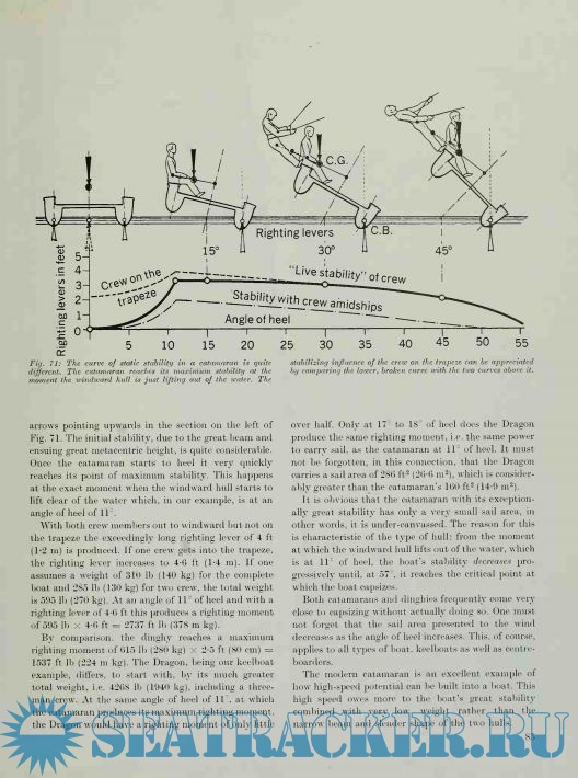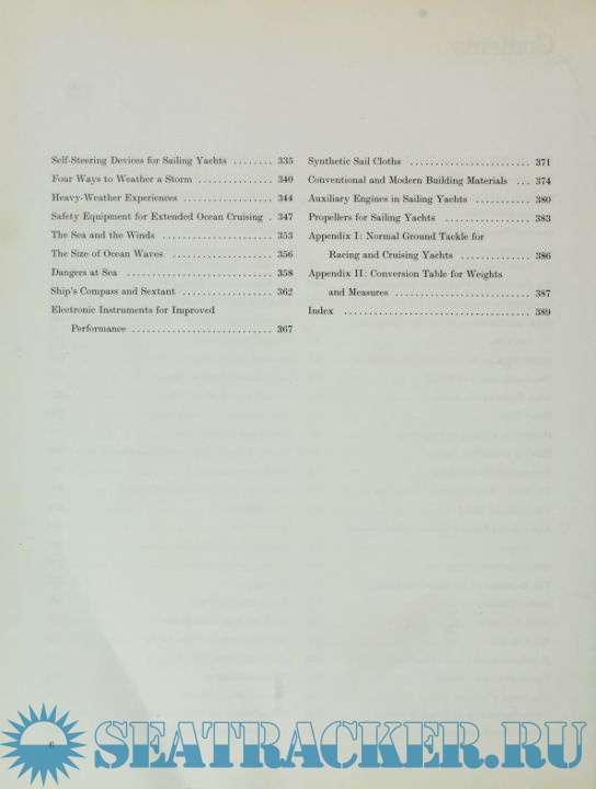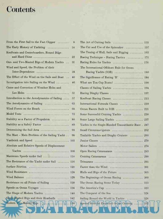 The book contains detailed discussions of aerodynamic theory, yachting history, techniques, hydrodynamics, rating rules, classes, safety at sea, sails, navigation, and other topics.