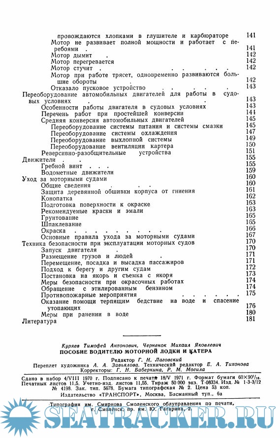 Год выпуска: 1971 Язык: русский Автор: Куряев Т.А., Черненок М.Я. Жанр: Практическое пособие Издательство: Транспорт Издание: 4-е изд., перераб. и доп. Формат: PDF Качество: Отсканированные страницы Количество страниц: 185 Описание: В книге, рассчитанной на широкий круг любителей водно-моторного спорта и туризма, приведены основные сведения об устройстве и снабжении маломерных моторных судов, рассмотрены вопросы приспособления автомобильных двигателей для работы в судовых условиях, даны советы по технике безопасности при эксплуатации любительских судов. Авторы знакомят читателя с устройством и обслуживанием наиболее распространенных подвесных моторов,с правилами регистрации судов и порядком получения документов на право управления ими, с необходимыми сведениями из общей лоции рек, со знаками судоходной обстановки на реках, каналах, водохранилищах и озерах. В пособии рассмотрены основные положения «Правил плавания по внутренним судоходным путям РСФСР» и «Правил для предупреждения столкновений судов в море», изложены советы по управлению маломерными моторными судами.