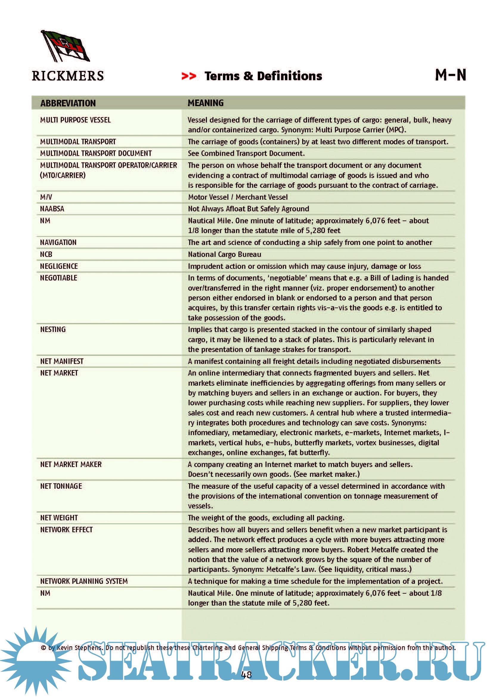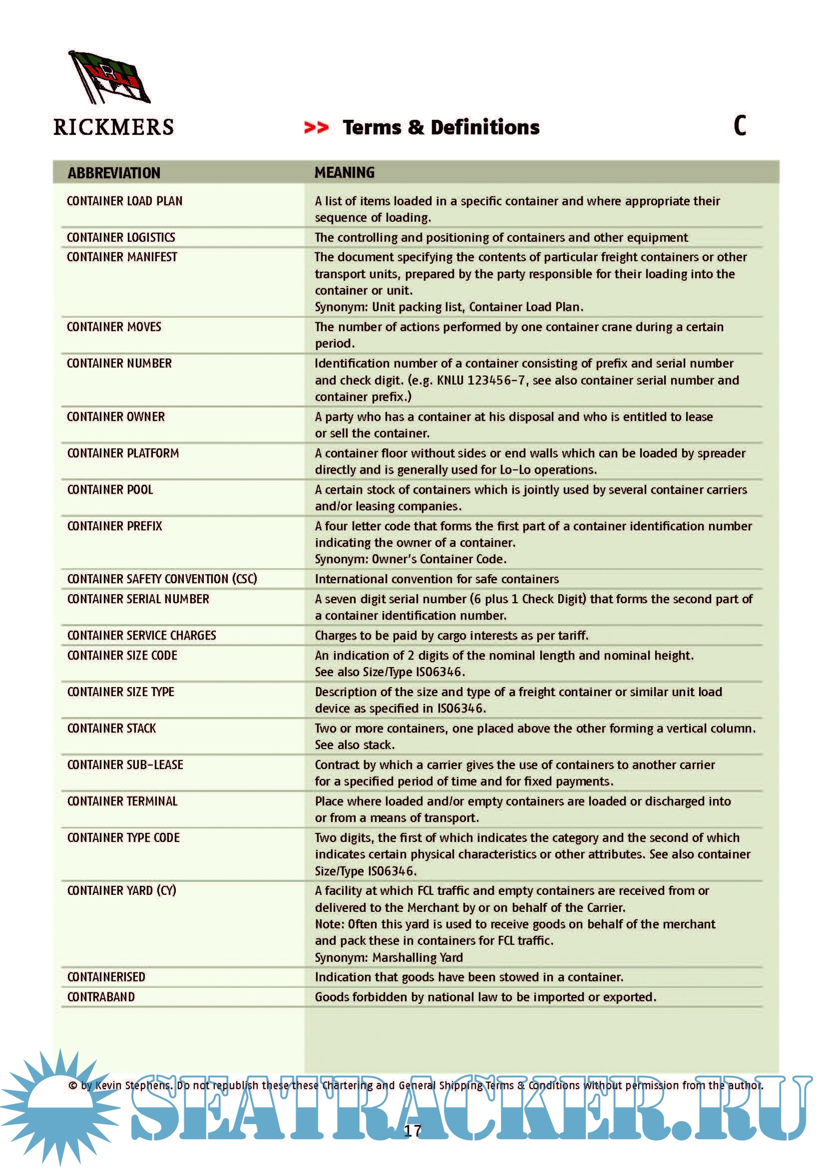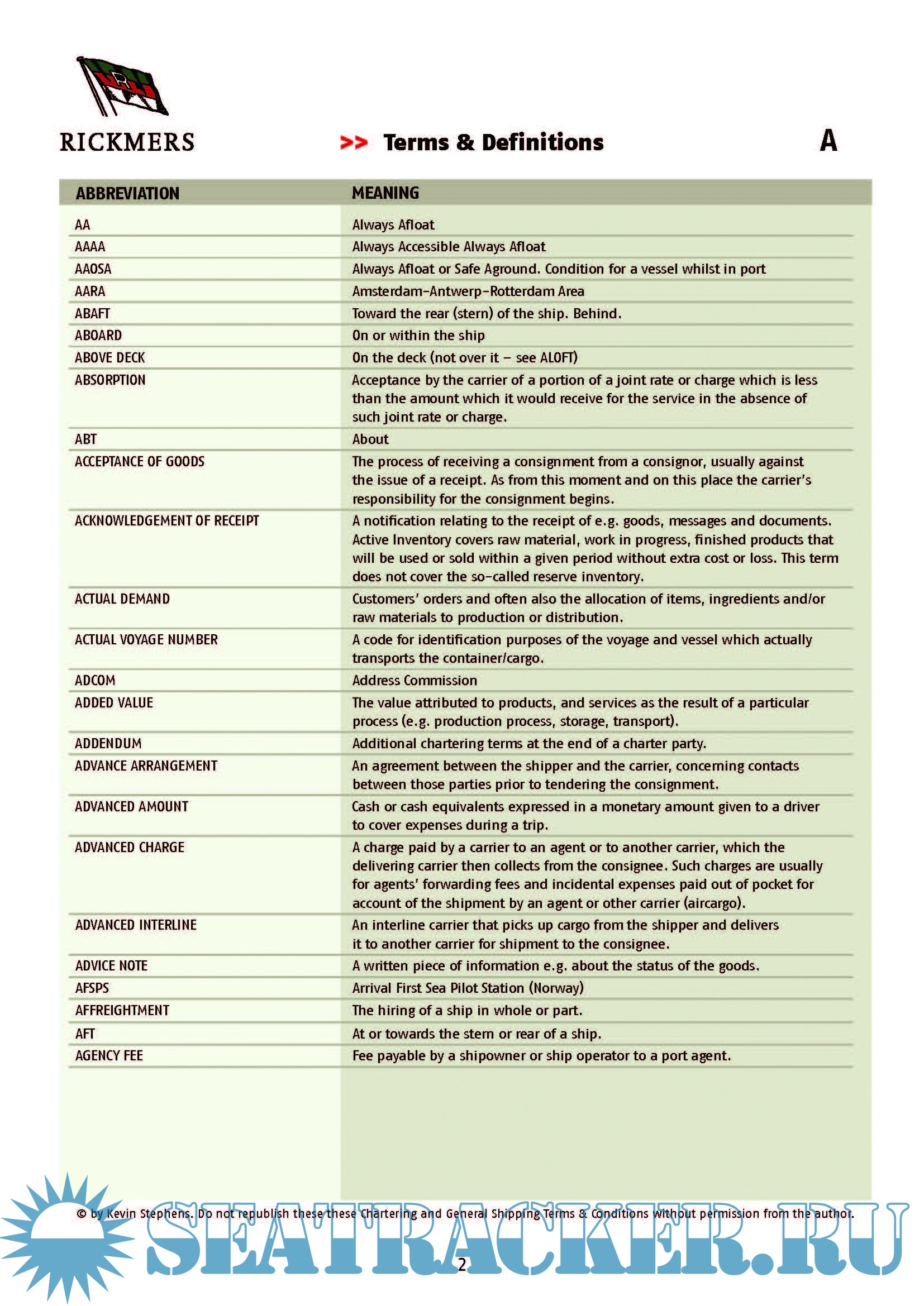Year: 2007 Language: english Author: Kevin Stephens (Rickmers-Linie) Genre: Practical guide Publisher: Rickmers-Linie [Hamburg] Format: PDF Quality: eBook Pages count: 76 Description: This document contents a non-exhaustive list of frequently used chartering and general shipping abbreviations and their definitions that you may come across from time to time.
