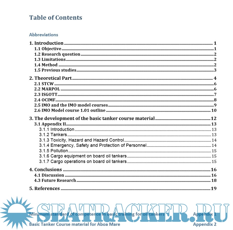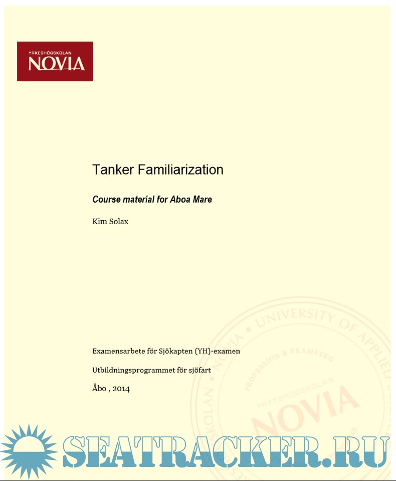 Description: The aim with this thesis is to provide Aboa Mare with an updated material to their tanker familiarization course. Furthermore my aim is to provide new future deckhands joining a tanker with essential need to know information that will help them perform their duties on board a tanker. The course material should meet the requirements established by both the STCW and the IMO. The tanker familiarization material is based on STCW, chapter V which states the mandatory minimum requirements for the training and qualification for masters, officers and ratings on oil tankers. Furthermore the IMO has developed a series of model courses for maritime training institutes worldwide which provides the institutes with detailed information such as course timetables, learning objectives, course framework, a course outline, guidance notes for the instructor and a summary of how students should be evaluated. After participating the IMO Model course 1.01, tanker familiarization the candidate should be able to show basic knowledge and understanding in safe cargo operations on board oil tankers, precautions to prevent hazards, apply occupational health and safety precautions and measures, carrying out fire-fighting operations, know how to respond to emergencies and take precautions to prevent pollution of the environment. This thesis is based on a literature research