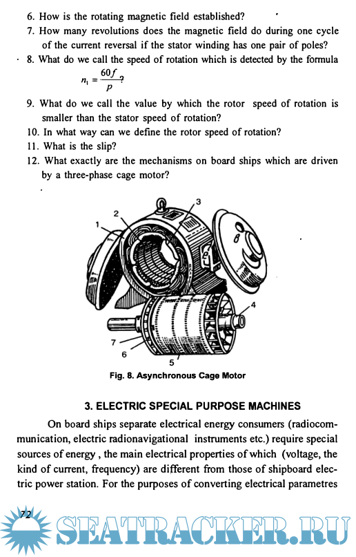PREFACE UNIT 1. NATURE OF ELECTRICITY 1. PRIMARY INVESТIGATIONS. CLASSES OF ELECTRICITY 2. MAGNETISM. ELECTROMAGNETISM. MAGNETIC FIELD 3. ELECTRIC CURRENTS AND THEIR PROPERTIES 4. BASIC UNIТS OF ELECTRICITY AND MEASURING DEVICES EXERCISES UNIT 2. SHIP'S DIRECT CURRENT ELECTRIC МACHINES 1. ТНЕ CONSTRUCTION AND ТНЕ PRINCIPLE OF OPERATION 2. D.C. GENERATORS AND THEIR CHARACTERISTICS 3. APPLICATION OF D.C. GENERATORS AND THEIR PARALLEL OPERATION EXERCISES UNIT 3. D.C. MOTORS 1. CONVERTIBILITY 2. E.M.F., TORQUE, POWER 3. STARTING, SPEED REGULATION. REVERSAL EXERCISES UNIT 4. ТУРЕS OF D.C. MOTORS AND THEIR DISПNCТIVE FEAТURES 1. SHUNT-WOUND MOTORS 2. SERIES-WOUND MOTORS 3. COMPOUND-WOUND MOTORS EXERCISES UNIT 5. TRANSFORMERS 1. PURPOSE, CONSTRUCTION, TYPES 2. THREE-PHASE TRANSFORMERS 3. SPECIAL TRANSFORMERS 4. AUTOTRANSFORMERS EXERCISES