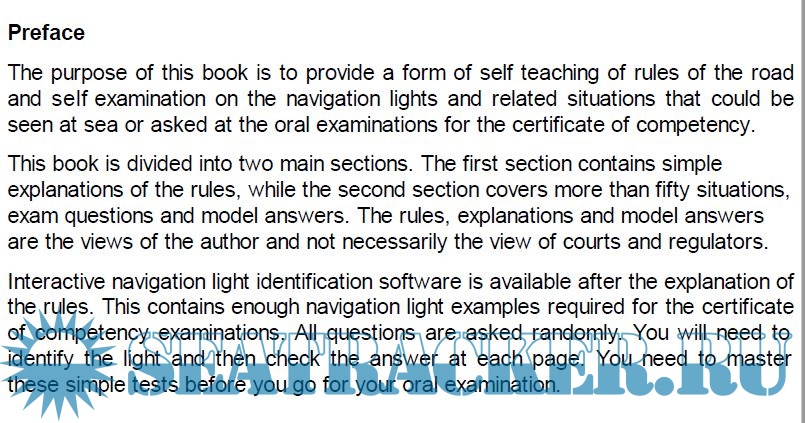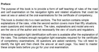 Description: A self-teaching aid that covers International regulations for preventing collision at sea 1972 (Colregs) or Rules of the Road, including navigation lights and related situations that could be asked within the Maritime and Coastguard Agency oral examinations for the deck certificate of competency.