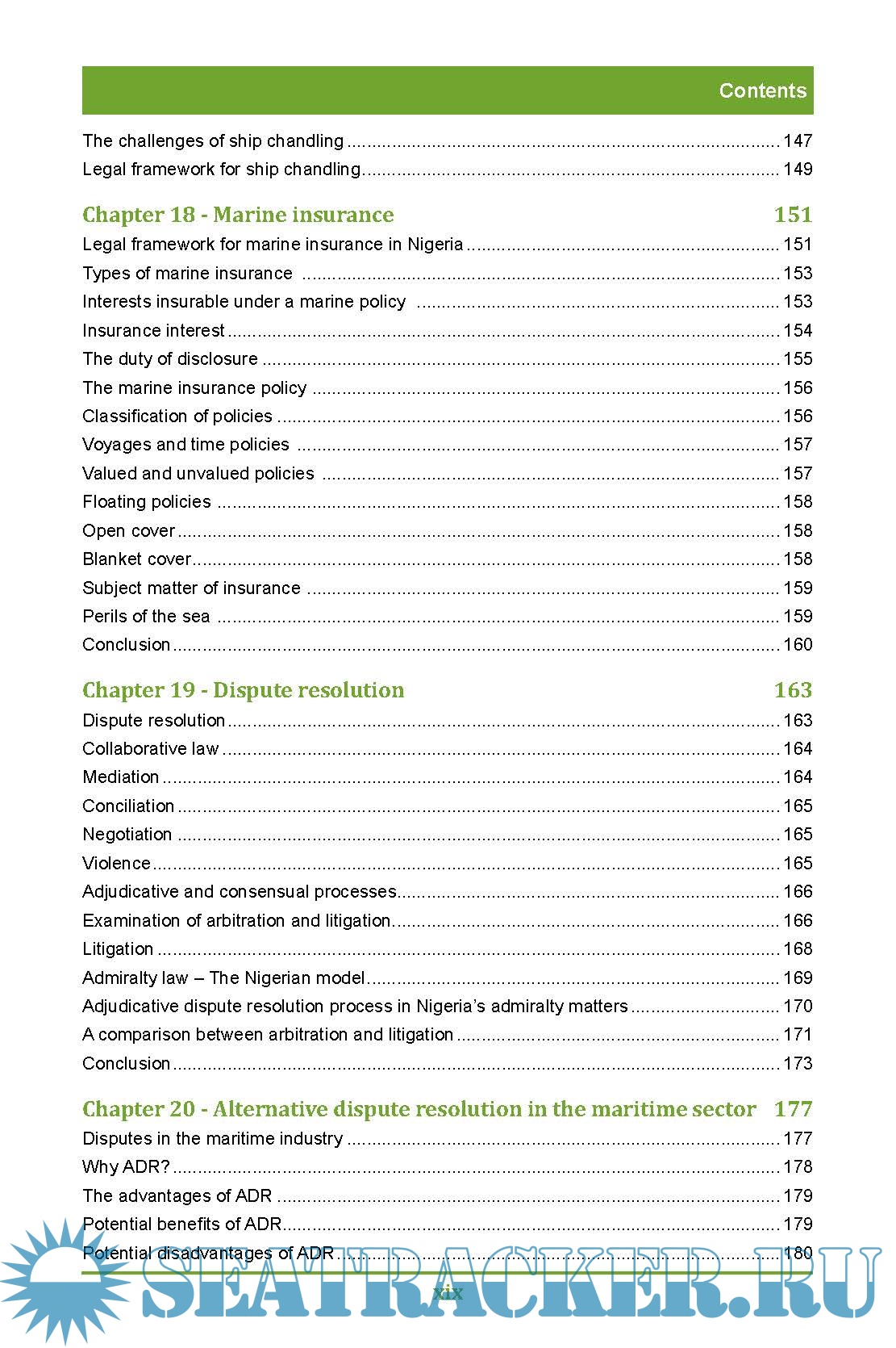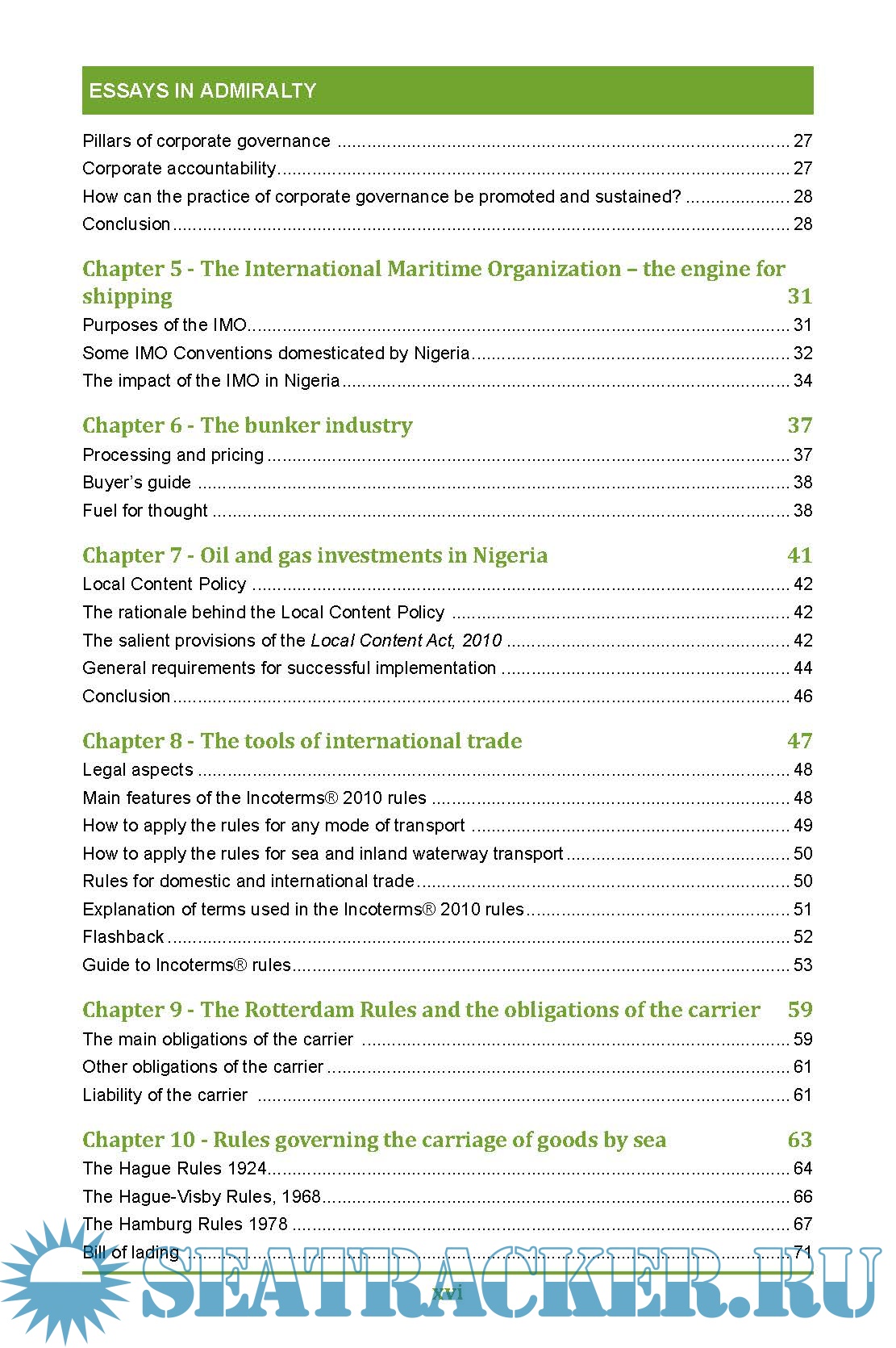 Year: 2012 Language: english Author: Jean Chiazor Anishere Genre: Reference book Publisher: Petrospot Limited Edition: First Edition ISBN: 978-0-9548097-9-9 Format: PDF Quality: OCR without errors Pages count: 211 Description: Essays in Admiralty is an important addition to the growing body of publications on maritime law and practice in Nigeria. The book covers a wide range of subjects and these are treated with the author’s characteristic lucidity. She simplifies and analyses the provisions of complex international rules and regulations, and practical subjects such as the use of inland container depots and bonded terminals, as well as ship chandling, multimodal transport and ship financing, are explained with clarity. Very substantive maritime law subjects such as marine insurance, carriage of goods by sea, maritime liens and cargo claims are presented in a manner that will be appreciated by lawyers in general.