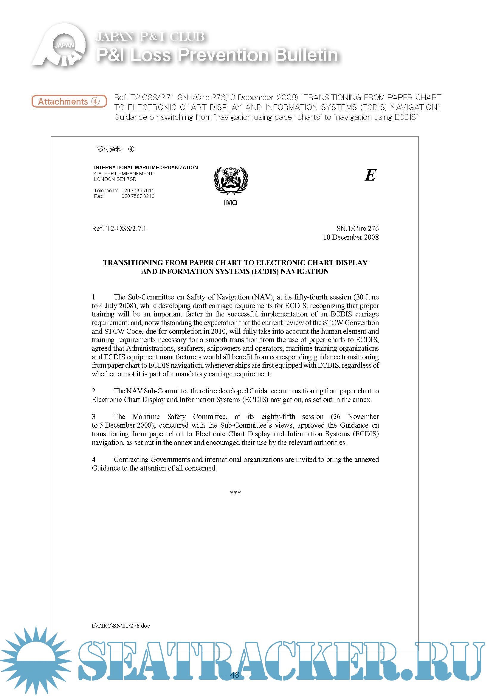 Year: 2017 Language: english Author: Japan P&I Club Genre: Guide Format: PDF Quality: eBook Pages count: 52 Description: Before the introduction of ECDIS, a paper nautical chart was used to create a navigation plan. A Gyro compass, radar and radio navigation equipment were used calculate the ship’s position, and this information was transcribed on the paper chart. Also, with the appearance of the GNSS (Global Navigation Satellite System, GNSS being the generic term for the satellite positioning system known as GPS (USA), GLONASS (Russia), and Galileo (EU)), we were able to obtain highly accurate position information according to Latitude and Longitude , but the position of the vessel continued to be checked using a paper nautical chart.