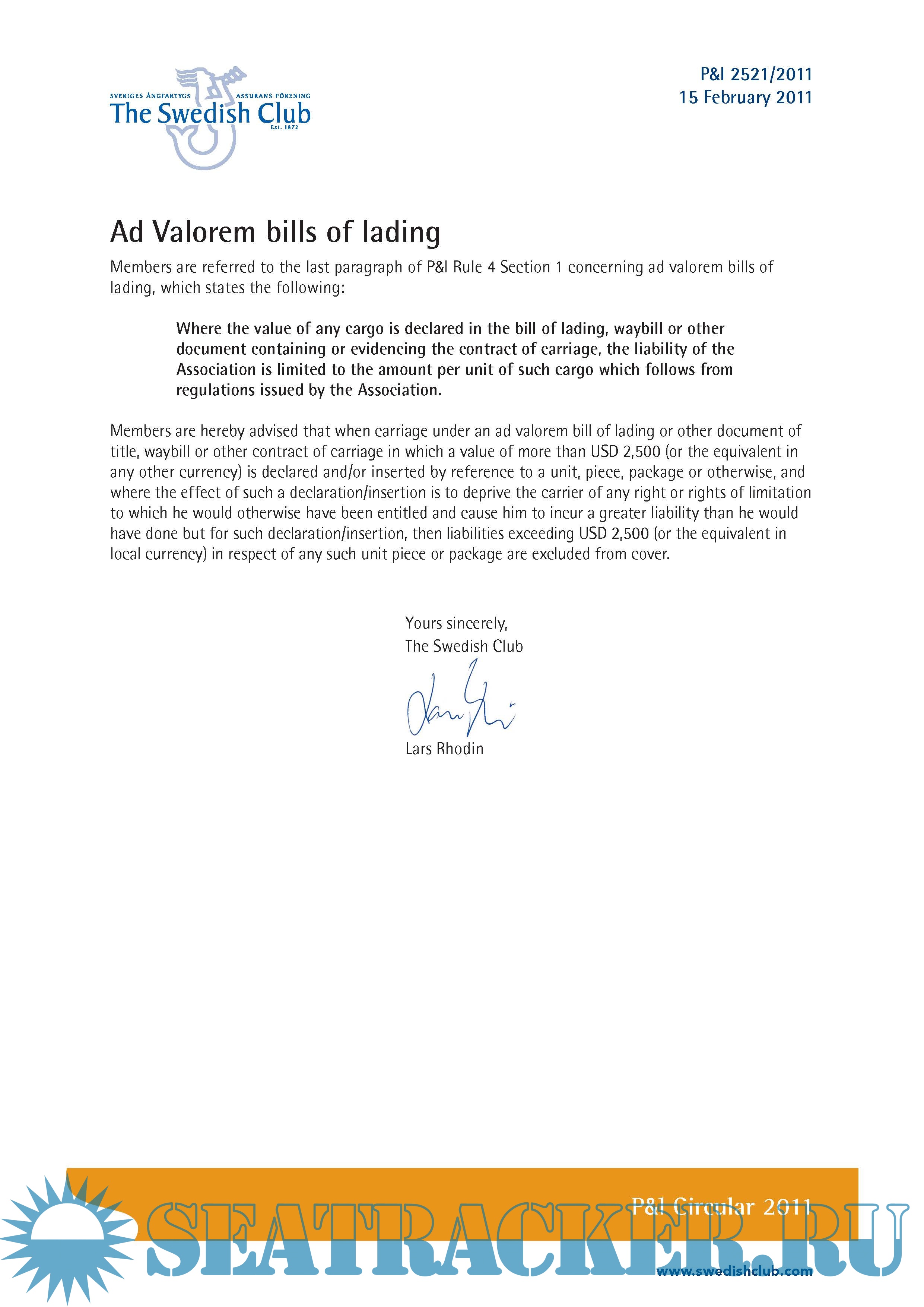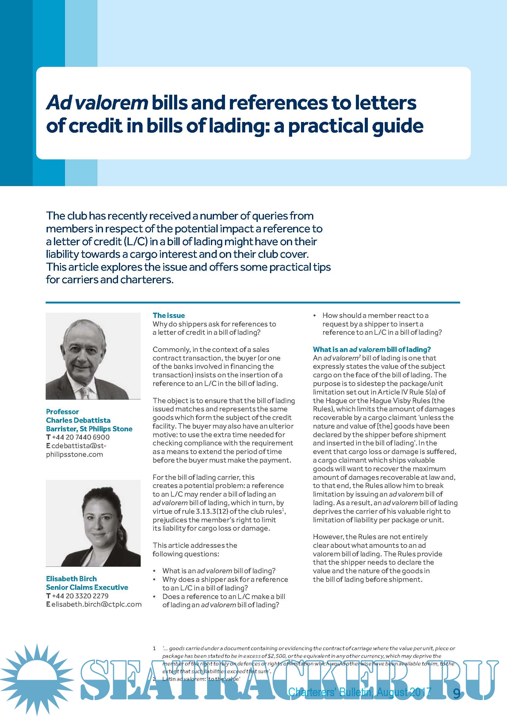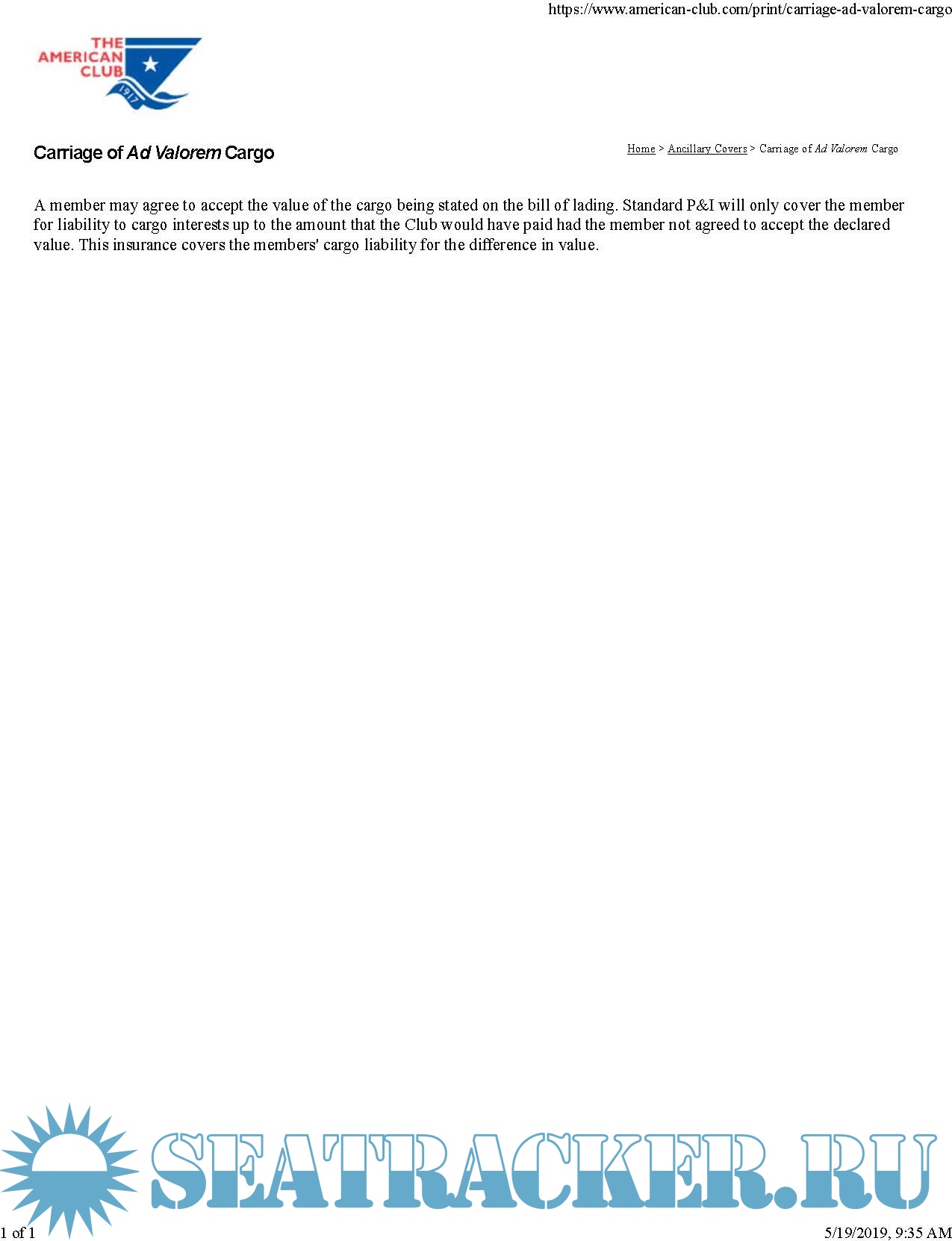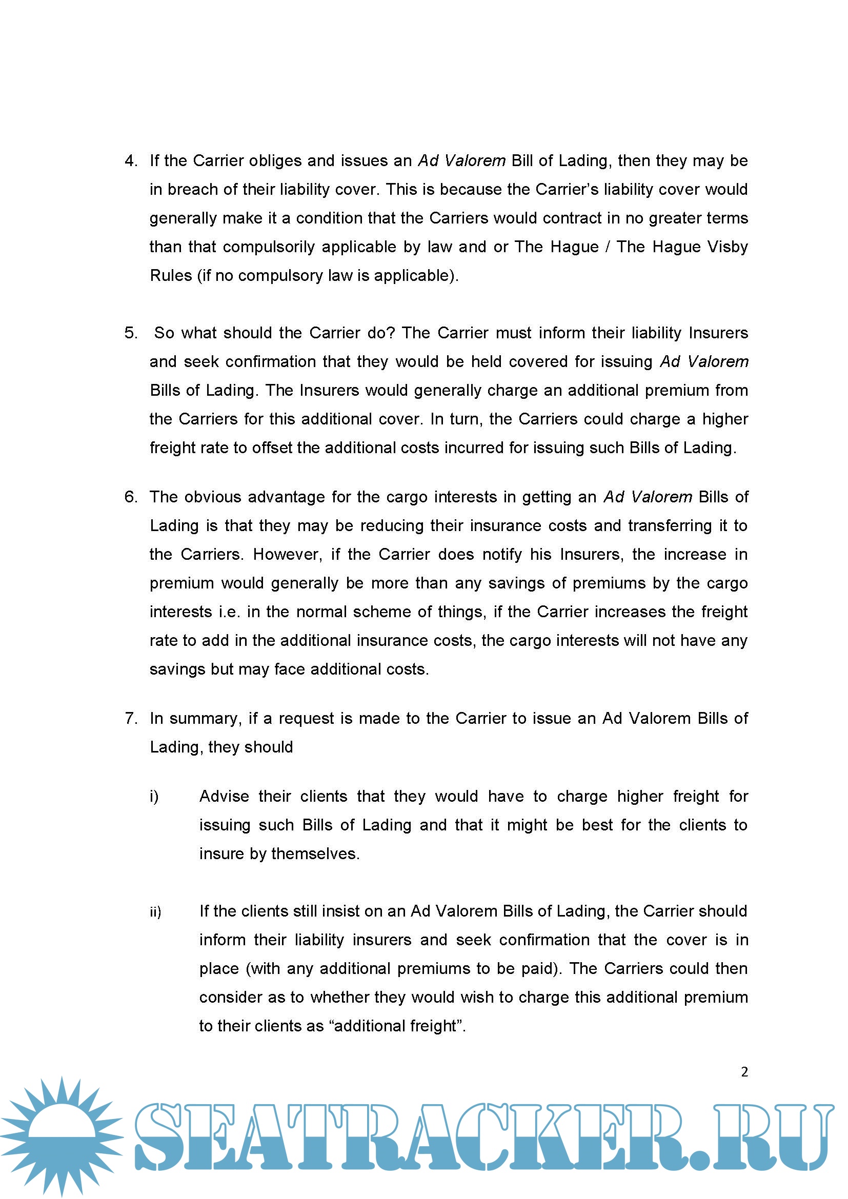 Year: 2019 Language: english Author: International Group of P&I Clubs Genre: Lectures Format: PDF Quality: eBook Pages count: 16 Description: Ad Valorem - (“at value”) – an ad valorem freight rate is one where the freight is based on the value of the goods. An ad valorem bill of lading is one where the value of the goods is shown on the face of the document, which value then becomes the carrier’s limit of liability, in return for this increased liability the carrier will charge an addition to the sea freight. The carrier must avoid (has to fight) the shipper's intention to mention the Sale Contract, the Letter of Credit (LOC) or Invoice Number on the B/L, since such reference may turn the B/L to an Ad Valorem B/L as regards the carrier’s limit of liability. Instead, the Carrier needs to incorporate the Hague/Hague-Visby Rules in the B/L.