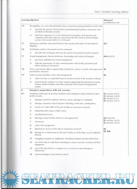 Description: This model course is intented to provide the knowledge required for port facility personnel with designated security duties, such as guards, access control officers, training officers and relevant port facility managers, in connection with a Port Facility Plan ( PFSP) to perform their duties in accordance with the requirements of the International Convention of the Safety of Life at Sea (SOLAS) , Chapter XI-2, the International Ship and Port Facility Security (ISPS ) Code, the International Maritime Dangerous Goods (IMDG) Code, the IMO/ILO Code of Practice on Security in Ports, and guidance contained in IMO MSC.1/Circ.1341 on Guidelines on Security-related training and familiarization for port facility personnel.