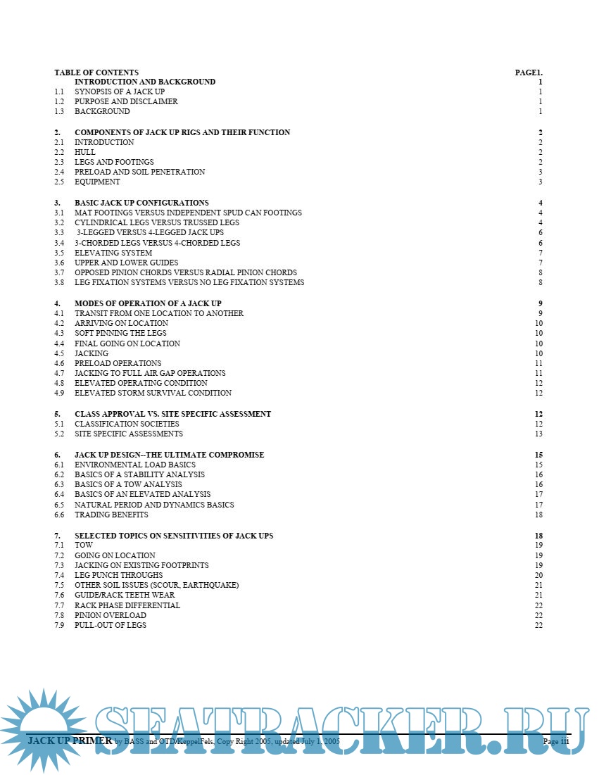 Year: 2005 Language: english Author: J.Vazquez, R.Michel Publisher: Keppel FELS and Keppel Offshore and Marine Format: PDF Quality: eBook Pages count: 24 Description: Jack Up Units are complex structures used offshore in many modes of operation. When using a particular Unit at a givensite, it is important to be aware and understand the basics behind the different designs under different conditions. The focusof this primer is a simplified discussion of the various sensitivities of Jack Ups while in the different modes of operation. Itis hoped that by increasing the understanding of how Jack Ups work and behave as well as the sources of the loads actingon them, those making decisions with limited information willbe better equipped to respond toincidents and reduce theiroccurrence and/or consequences. Though there are many variations in design and purposes for Jack Ups, this primerfocuses many of these discussions on three-legged Units used for drilling. The primer starts by presenting somebackground and discussions of the basics of Jack Up components analyses. This is followed by sections on Jack Up Components and Configurations, modes ofoperation, differences between Classapproval and site specific assessment, basic analysis, and a discussion of competing aspects of Jack Up design.
