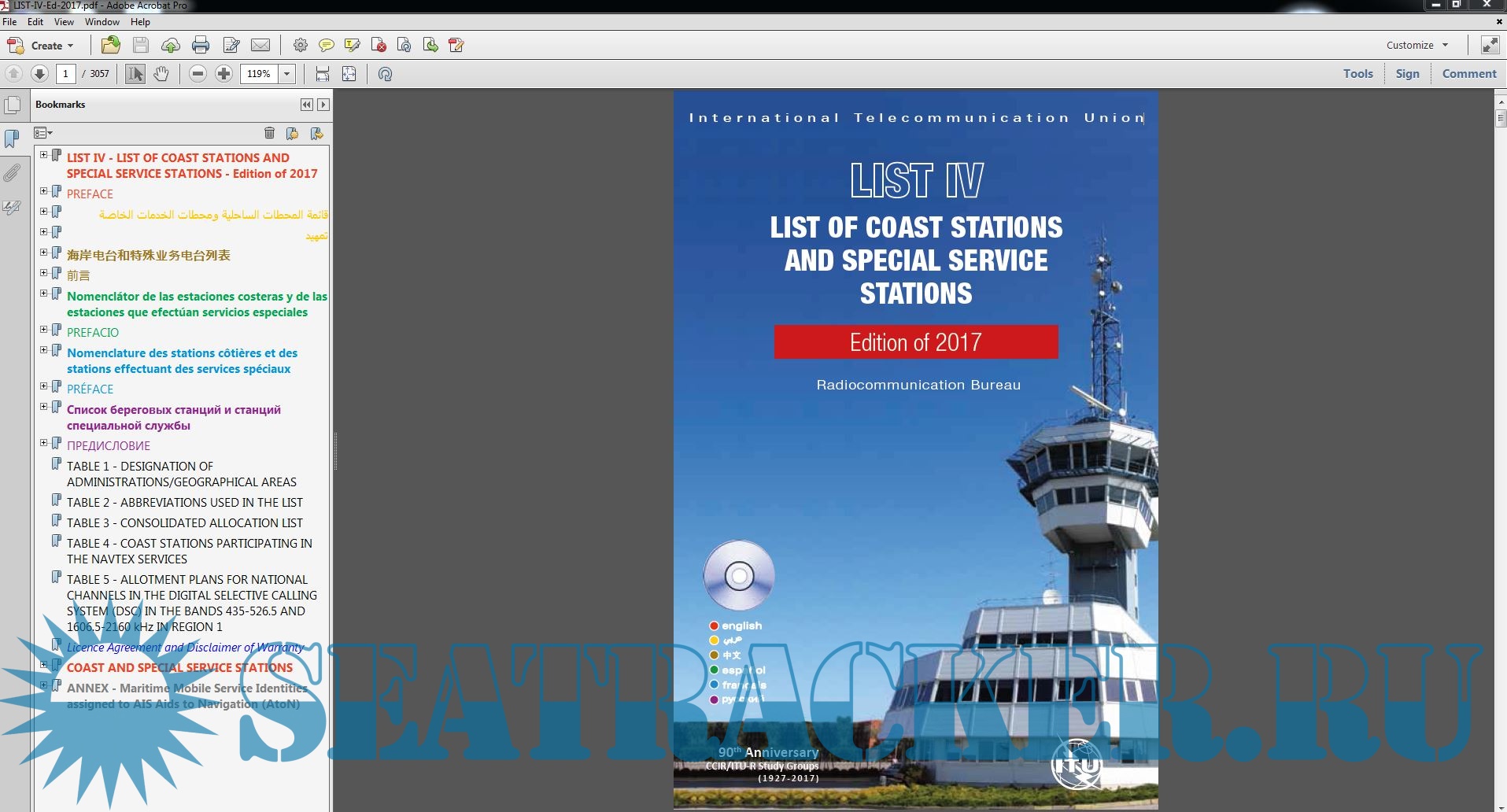 Year: 2017 Language: multilingual Author: ITU Publisher: ITU Format: PDF+CD Quality: eBook Pages count: 500 Description: List IV contains important information for the mariner in relation to radiocommunications, including the GMDSS (Global Maritime Distress and Safety System). Detailed information such as the frequencies for transmitting and receiving, in addition to geographical coordinates, is provided for maritime coast radio stations, including those assuming watch-keeping using digital selective calling (DSC) techniques and radiotelephony. List IV also supplies details of additional services such as medical advice, navigational and meteorological warnings, MSI (Maritime Safety Information), AIS (Automatic Identification System), meteorological bulletins and radio time signals, along with the hours of service and operational frequencies, information on port stations, pilot stations, coast Earth stations, VTS stations, contact information of RCC (Rescue Coordination Centers), SAR agencies, Navarea coordinators and AtoNs (AIS Aids to Navigation). As stipulated in Appendix 16 to the RR, this List shall be provided to all ship stations for which a Global Maritime Distress and Safety System (GMDSS) installation is required by international agreement.