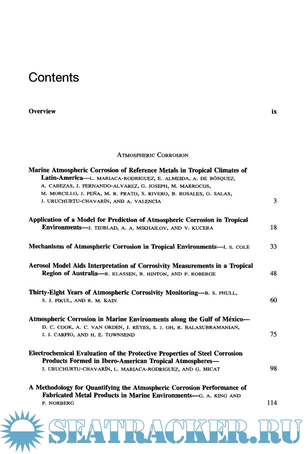Year: 2000 Language: english Author: Sheldon W. Dean, Guillermo Hernandez-Duque Delgadillo & James B. Bushman Genre: Research papers Publisher: ASTM ISBN: 0803128738 Format: PDF Quality: OCR without errors Pages count: 314 Description: This publication, Marine Corrosion in Tropical Environments, contains papers presented at the symposium of the same name held in Orlando, Florida, on 13 November 2000. The symposium was sponsored by ASTM Committee G01 on Corrosion of Metals, in cooperation with NACE International and the University of Mayab, Merida, Yucatan, Mexico. Sheldon W. Dean, Air Products and Chemicals, Inc., Guillermo Hernandez-Duque Delgadillo, Universidad del Mayab, and James B. Bushman, Bushman & Associates, presided as symposium chairmen and are editors of this publication.