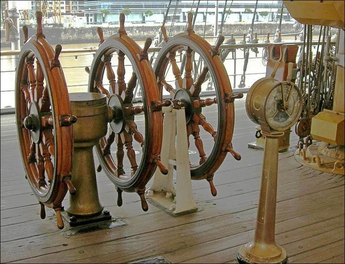 Штурвальное колесо с помощью штуртросов и блоков поворачивает в нужном направлении перо руля. Но нагрузка бывает такой сильной, что усилий одного или двух рулевых недостаточно, поэтому устанавливали сдвоенные и даже строенные штурвалы: