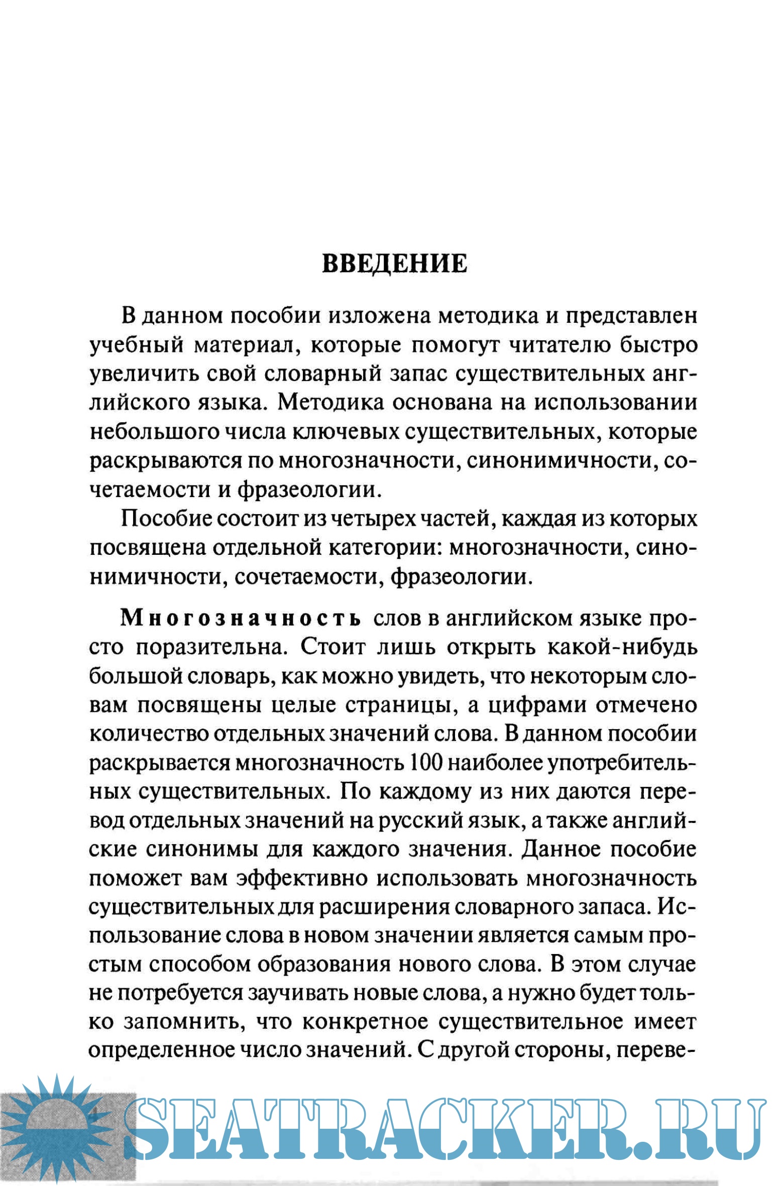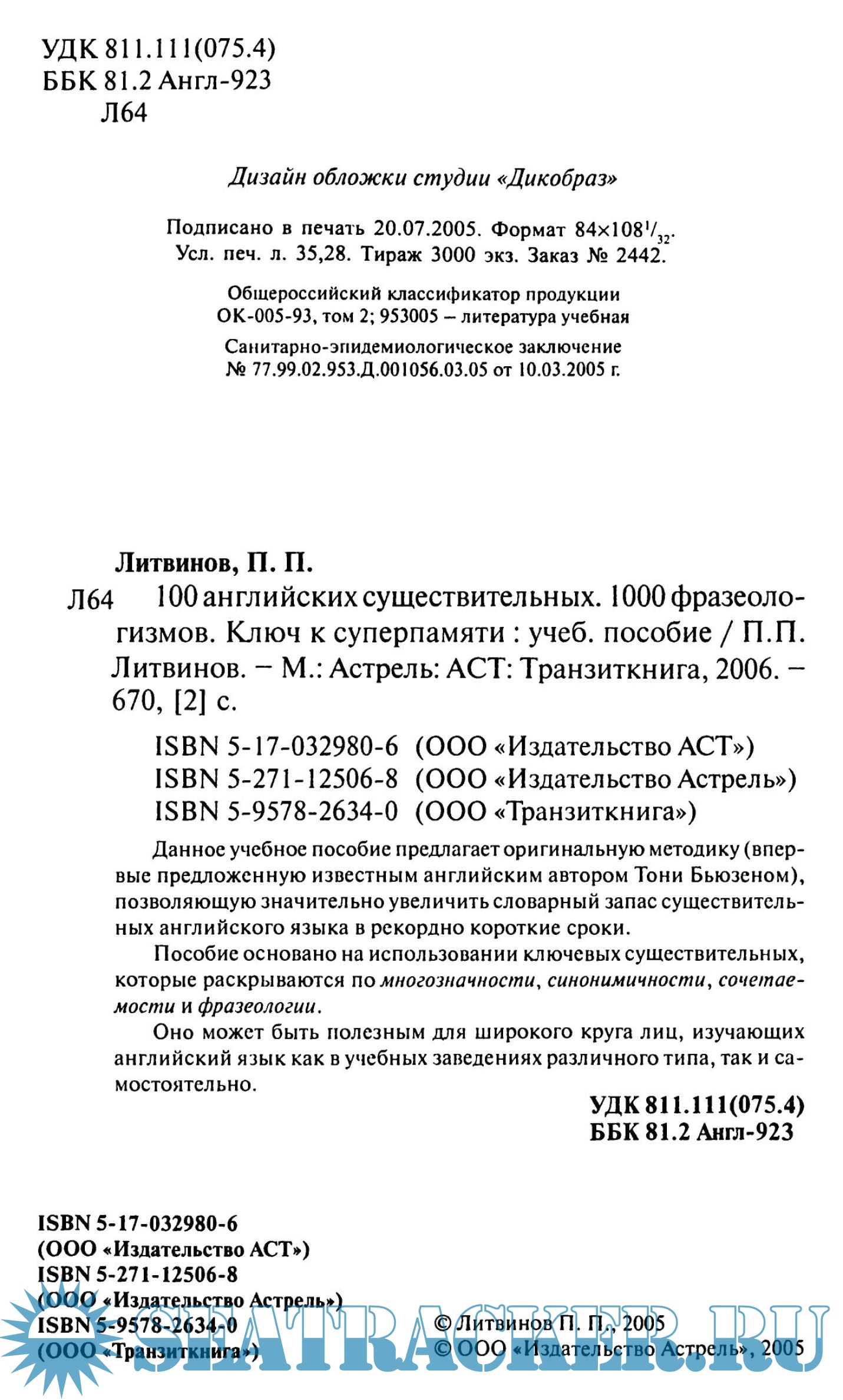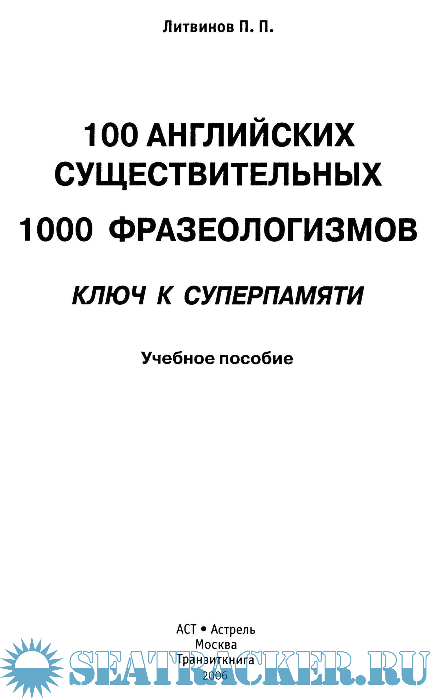 Год выпуска: 2005 Язык: Русский, Английский Автор: П.П.Литвинов Жанр: Учебное пособие Издательство: АСТ ISBN: 5-17-032980-06 Формат: PDF/DjVu Качество: Отсканированные страницы Количество страниц: 674 Описание: Данное учебное пособие предлагает оригинальную методику (впервые предложенную известным английским автором Тони Бьюзеном), позволяющую значительно увеличить словарный запас существительных английского языка в рекордно короткие сроки. Пособие основано на использовании ключевых существительных, которые раскрываются по многозначности, синонимичности, сочетаемости и фразеологии. Оно может быть полезным для широкого круга лиц, изучающих английский язык как в учебных заведениях различного типа, так и самостоятельно. Доп. информация: Посмотрите мои другие раздачи: https://seatracker.xyz/tracker.p...id=54420#results