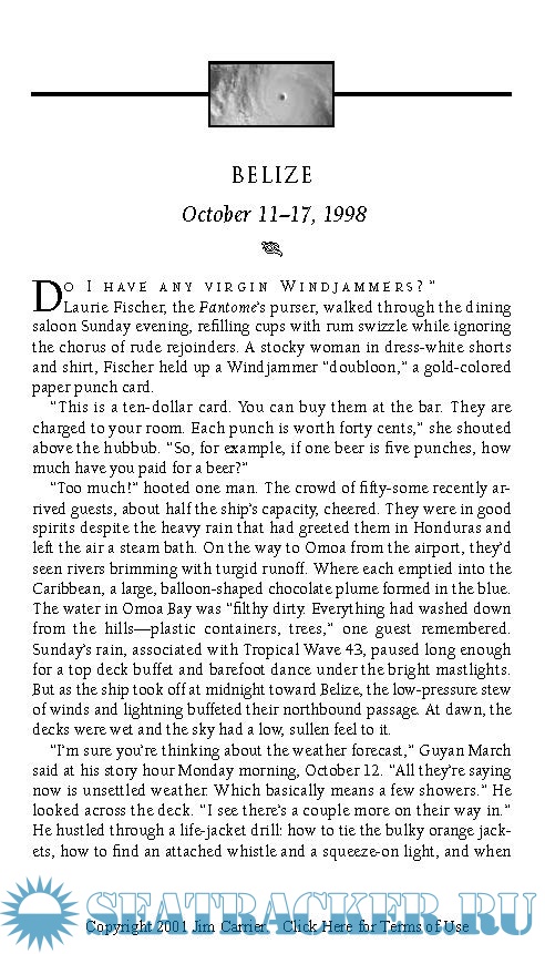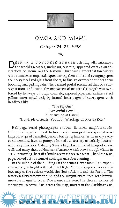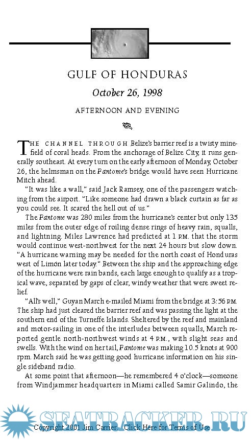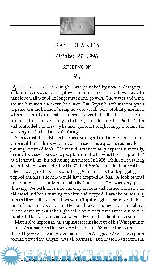 Description: In October 1998, Hurricane Mitch terrorized the Caribbean and Central America, leaving thousands dead, causing billions of dollars in damage, and crippling countries. In the midst of it struggled Guyan March, captain of the Fantome, the largest ship owned by Windjammer Barefoot Cruises. Having determined the Fantome was too big to seek safe harbour in any of the nearby ports, Windjammer and Captain March made the last-minute decision to take the ship out to sea in an attempt to get out of the storm's path. Carrier's account of this desperate race traces the development and erratic path of the storm as it consistently defied all predictions, relates the communications between Windjammer and the Fantome as they ran out of options and pieces together what must have been the last few minutes of the ship and of the crew's lives. The heart-wrenching testimony of the crew's families, horror stories of survivors on land, and scientific background from the meteorologists provide a thoroughly detailed context in which to view one of the worst hurricanes in recorded history.