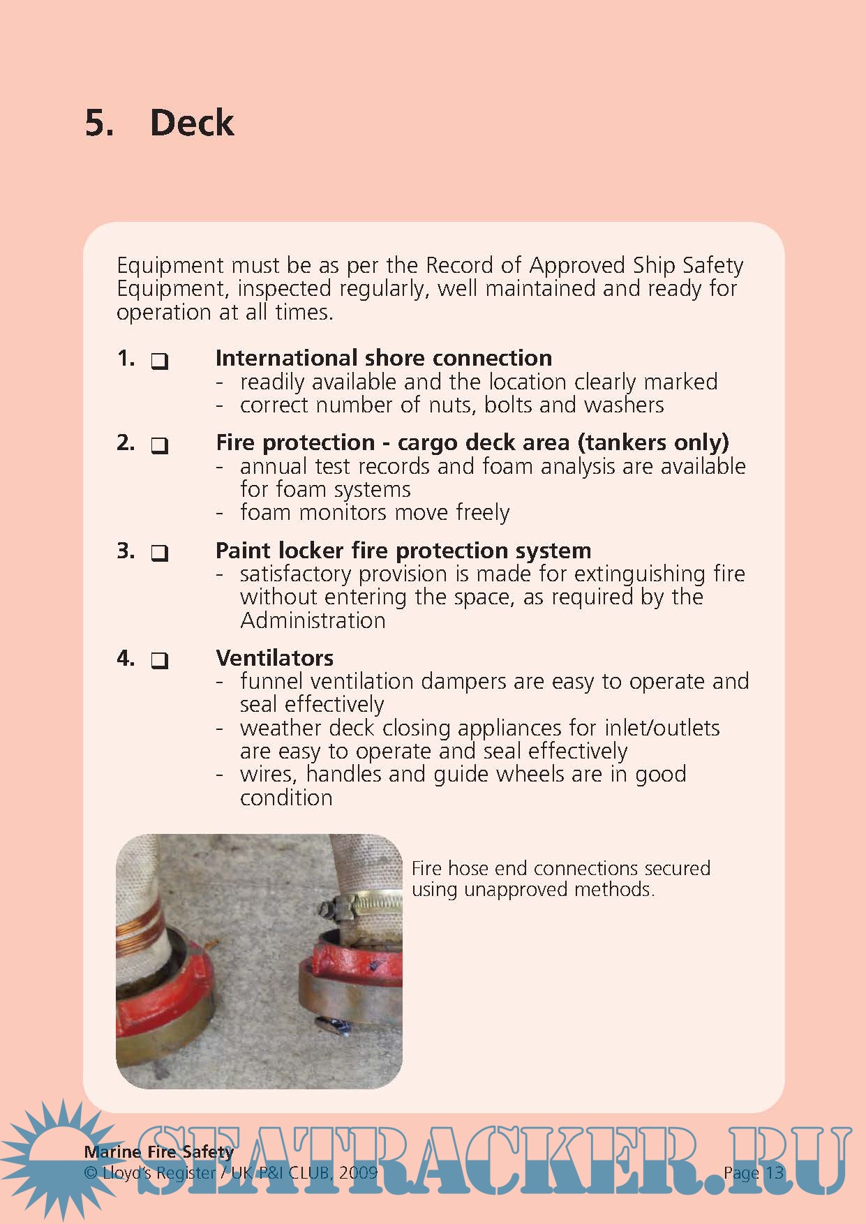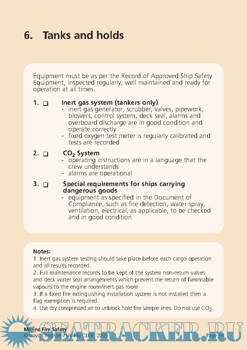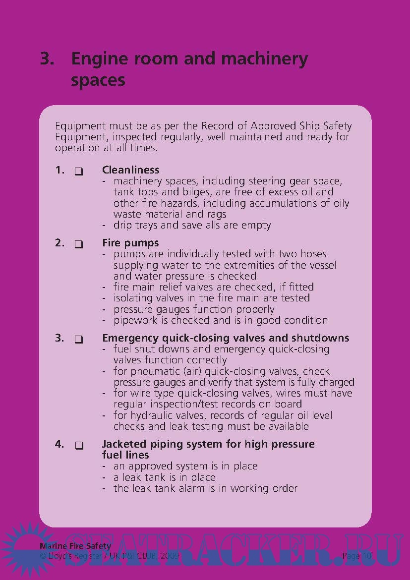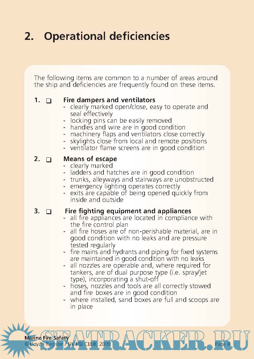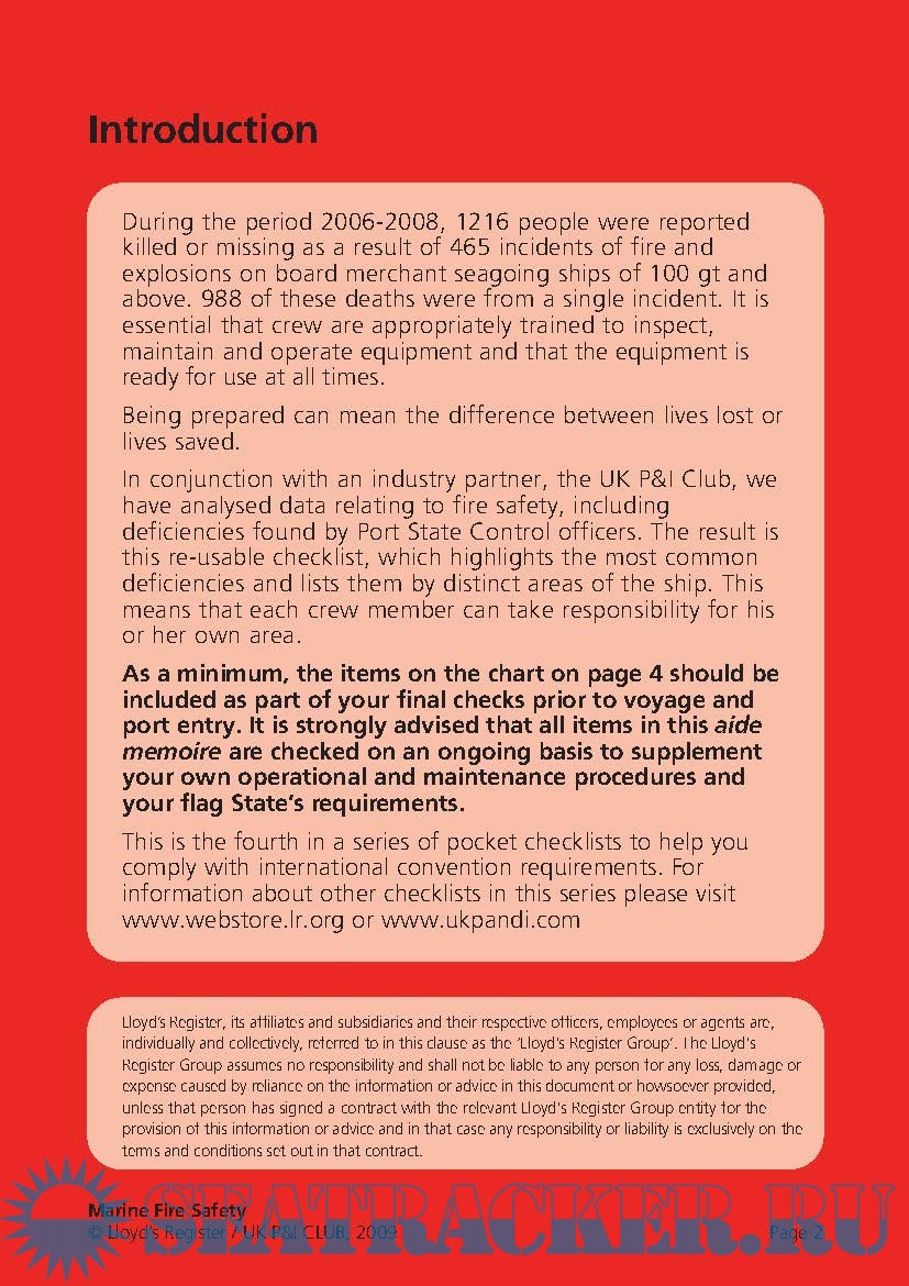 Year: 2009 Language: english Author: Lloyd's & UK P&I Club Genre: Methodological guide Format: PDF Quality: eBook Pages count: 18 Description: During the period 2006-2008, 1216 people were reported killed or missing as a result of 465 incidents of fire and explosions on board merchant seagoing ships of 100 gt and above. 988 of these deaths were from a single incident. It is essential that crew are appropriately trained to inspect, maintain and operate equipment and that the equipment is ready for use at all times. Being prepared can mean the difference between lives lost or lives saved. In conjunction with an industry partner, the UK P&I Club, we have analysed data relating to fire safety, including deficiencies found by Port State Control officers. The result is this re-usable checklist, which highlights the most common deficiencies and lists them by distinct areas of the ship. This means that each crew member can take responsibility for his or her own area.