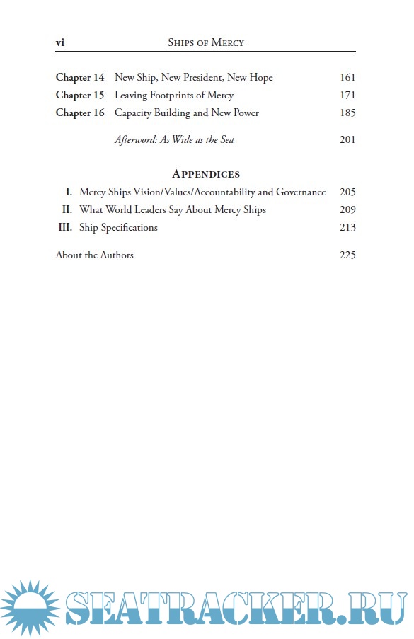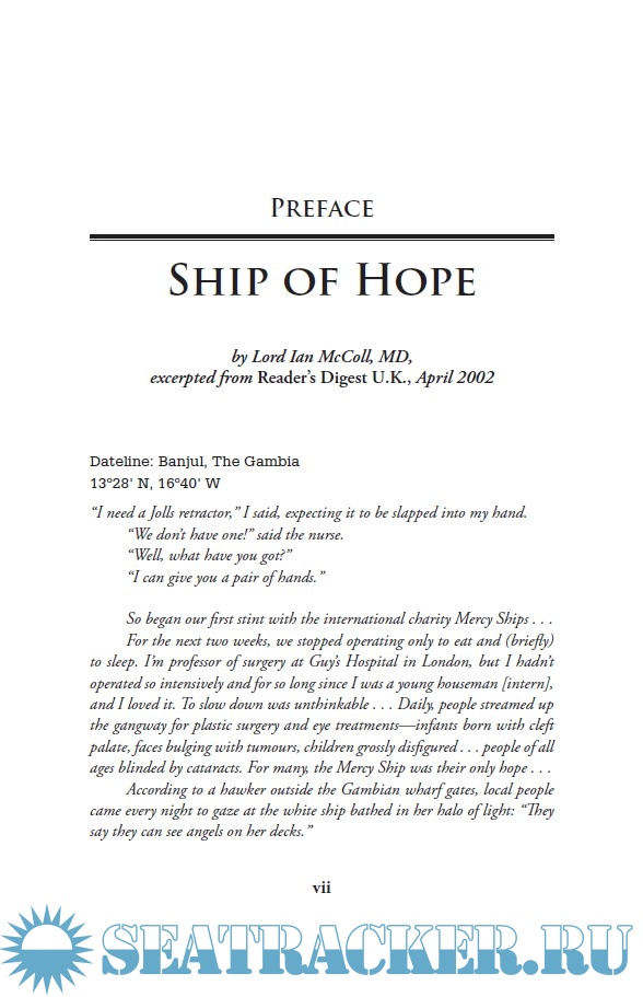 Don Stephens, a Colorado farm boy, is certainly an unlikely hero. And turning a decrepit ocean liner into a floating hospital seems improbable at best. And yet that is exactly what happened twenty-five years ago. Because of the efforts of Stephens, his fleet of ships, and his "navy" of volunteers, thousands around the world have experienced healing of body and spirit. Specializing in fixing facial deformities, Mercy Ships International embodies the great commission and demonstrates what God can do with a few willing hands and determined spirits. In Ships of Mercy, readers will realize the overwhelming need for this type of service and be inspired to lend a hand to make a difference.