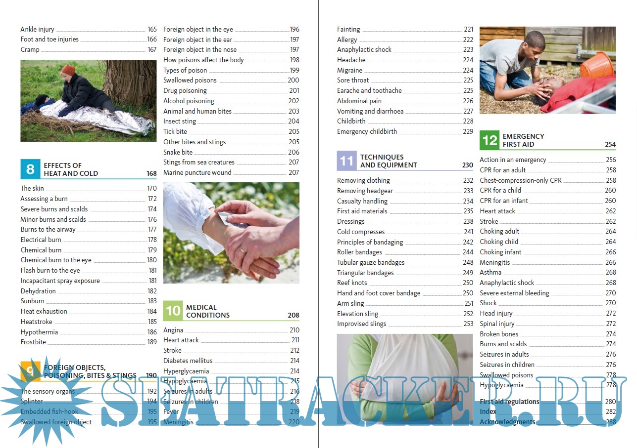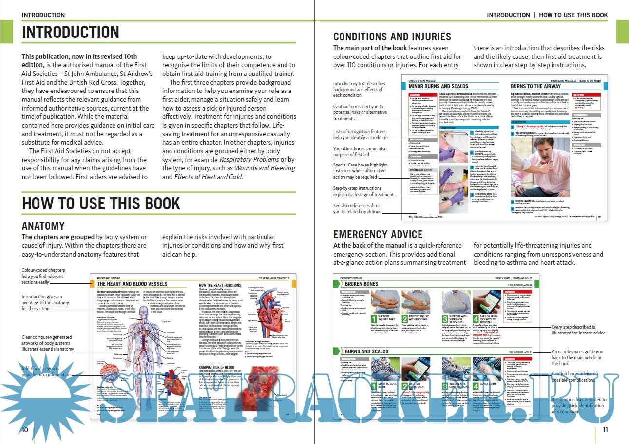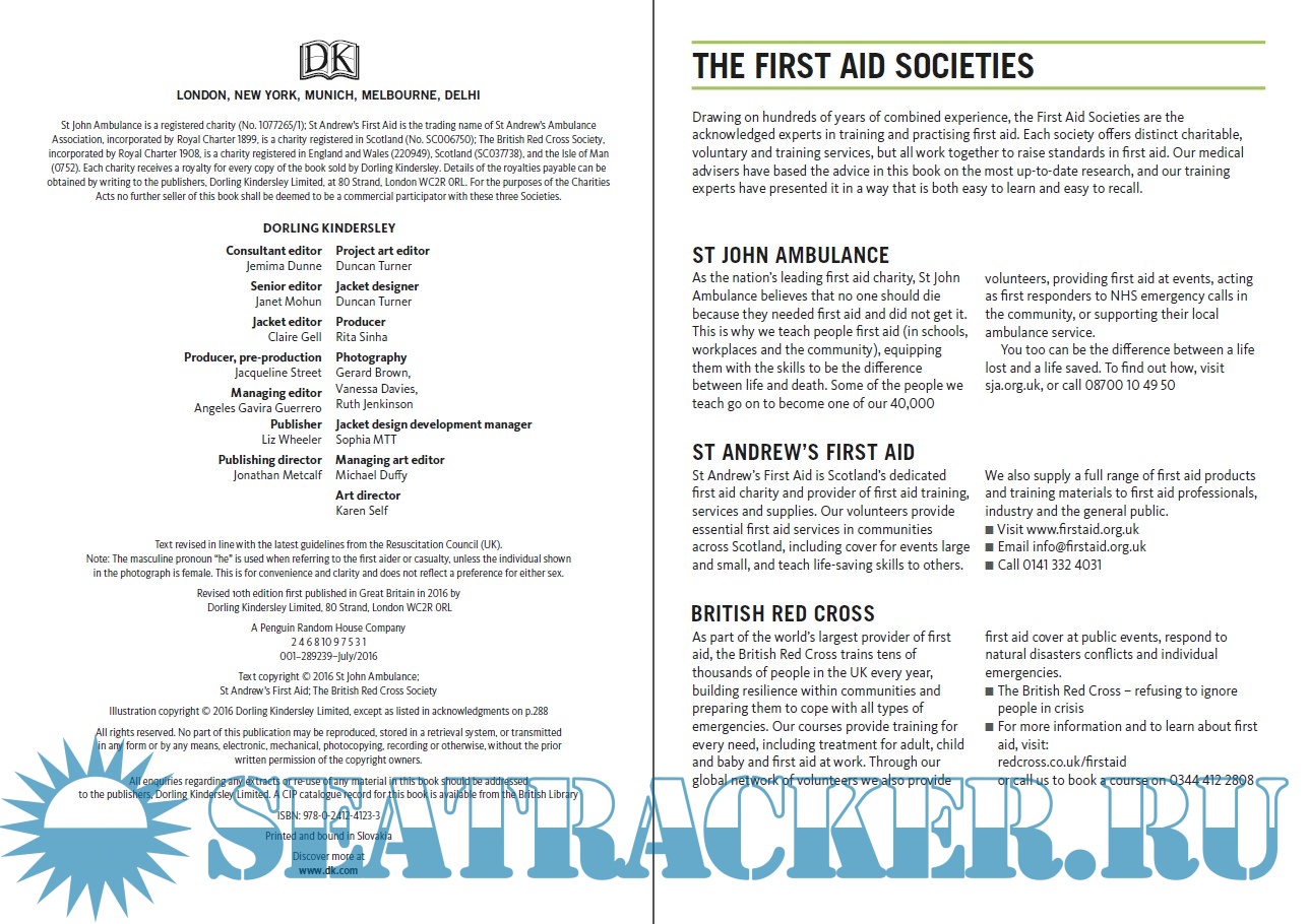 Year: 2016 Language: english Author: British Red Cross, St John Ambulance and St Andrew's Ambulance Association Genre: Manual Publisher: Dorling Kindersley Edition: 10th (Revised) ISBN: 978-0-2412-4123-3 Format: PDF Quality: eBook Pages count: 290 Description: This publication, now in its revised 10th edition, is the authorised manual of the First Aid Societies – St John Ambulance, St Andrew’s First Aid and the British Red Cross. Together, they have endeavoured to ensure that this manual reflects the relevant guidance from informed authoritative sources, current at the time of publication. While the material contained here provides guidance on initial care and treatment, it must not be regarded as a substitute for medical advice. The First Aid Societies do not accept responsibility for any claims arising from the use of this manual when the guidelines have not been followed. First aiders are advised to keep up-to-date with developments, to recognise the limits of their competence and to obtain first-aid training from a qualified trainer. The first three chapters provide background information to help you examine your role as a first aider, manage a situation safely and learn how to assess a sick or injured person effectively. Treatment for injuries and conditions is given in specific chapters that follow. Lifesaving treatment for an unresponsive casualty has an entire chapter. In other chapters, injuries and conditions are grouped either by body system, for example Respiratory Problems or by the type of injury, such as Wounds and Bleeding and Effects of Heat and Cold.