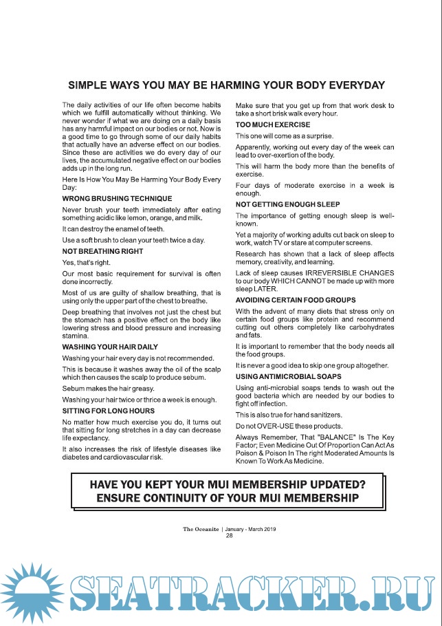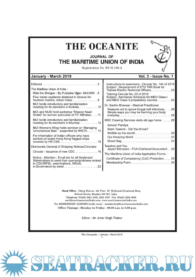 Year: 2019 Language: english Author: Maritime Union of India Publisher: Maritime Union of India Format: PDF Quality: eBook Pages count: >100 Description: Journal of the Maritime Union of India. 'The Oceanite' is India's first nautical magazine with the name coined for the Greek word 'Oceanid' which means a 'seanymph'