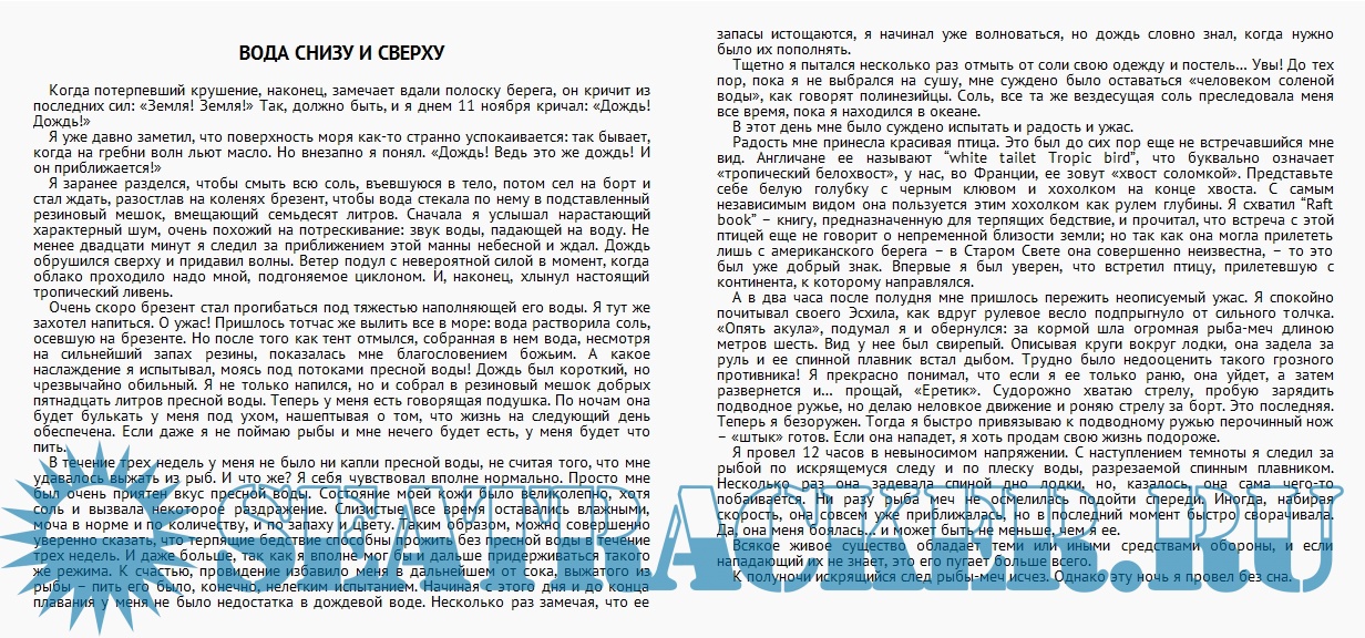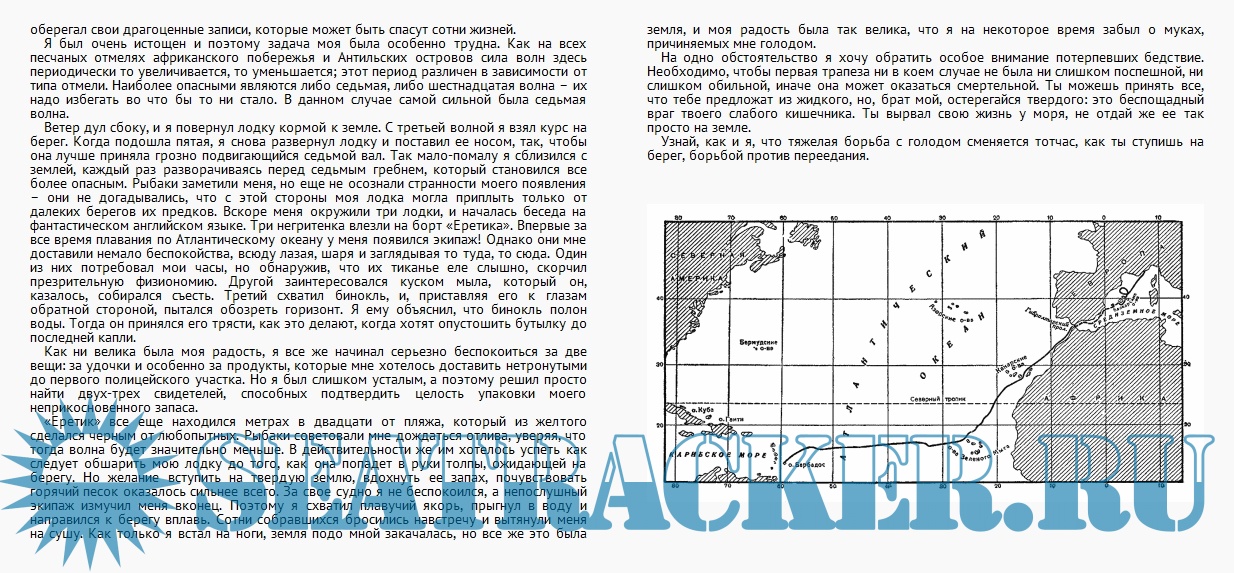 Описание: Рассказ о необычайных путешествиях, предпринятых молодым французским врачом Аленом Бомбаром в 1952 г. с целью доказать, что люди, потерпевшие кораблекрушение, могут прожить длительное время в море без запасов пищи и воды, питаясь только тем, что они могут добыть в море. А.Бомбар один пересек в маленькой резиновой лодке Атлантический океан за 65 дней. Все это время он питался исключительно сырой рыбой, которую он ловил, а пил только дождевую и морскую воду или сок, выдавленный им из рыб. Путешествие А.Бомбара не имеет себе равных в истории мореплавания.