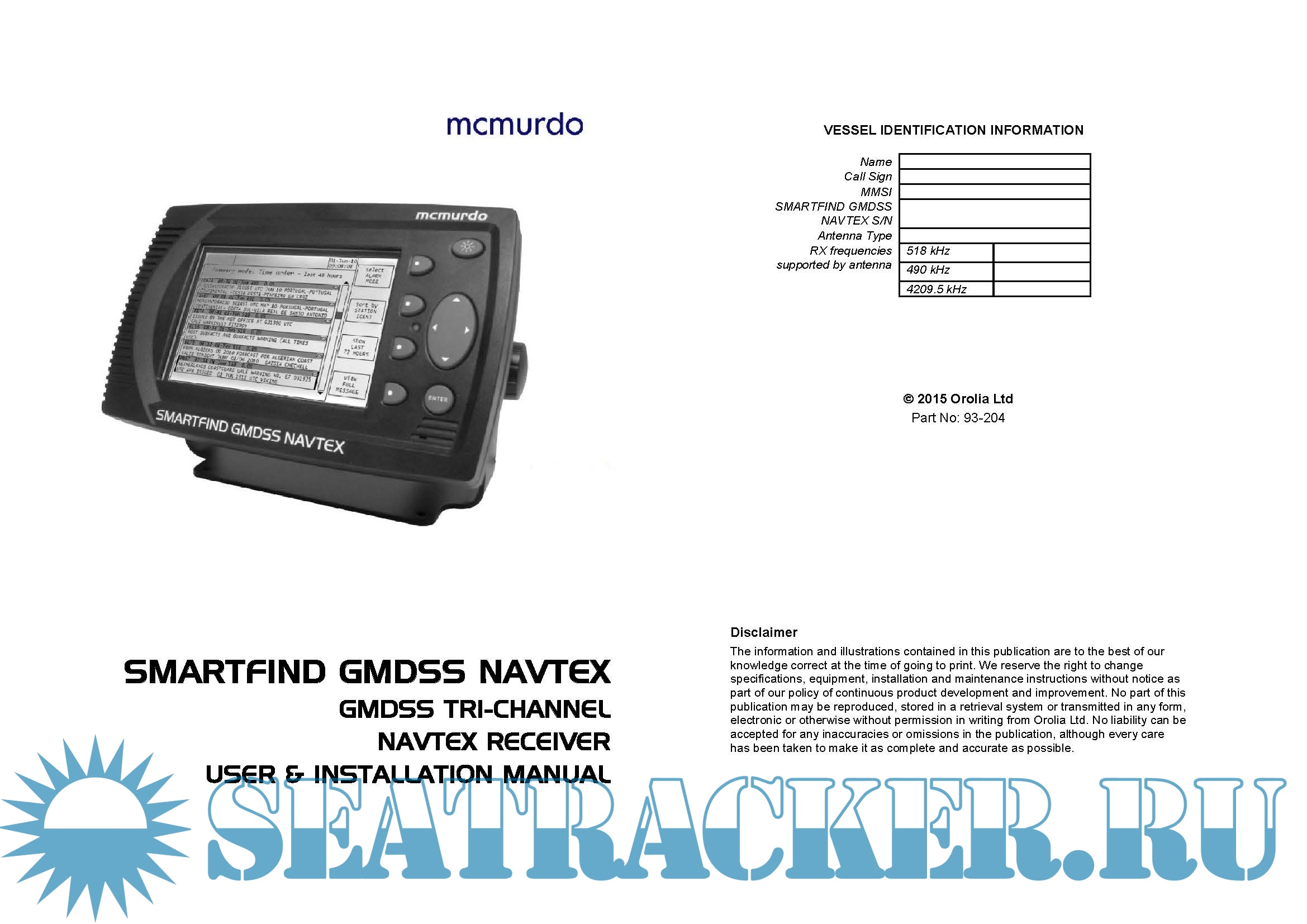 Mc Murdo Smartfind GMDSS Navtex, GMDSS Tri-Channel Navtex Receiver User & Installation Manual, updated 2016