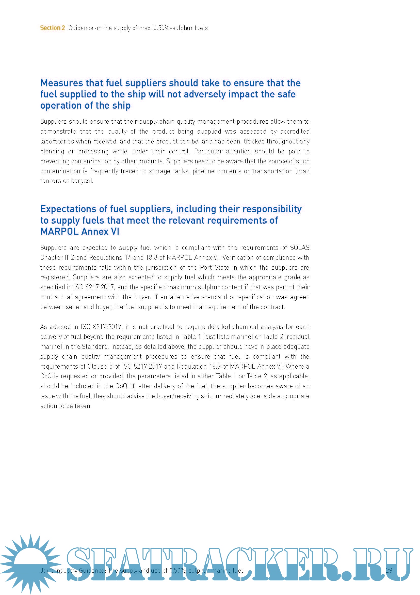 Year: 2019 Language: english Author: Joint Industry Project sponsors Genre: Guide Format: PDF Quality: eBook Pages count: 64 Description: In October 2016, the International Maritime Organization (IMO) confirmed a global limit for sulphur in fuel oil used on board ships of 0.50% m/m (mass by mass) to become effective on 1 January 2020. Alternatively, ships may continue to use fuels with a higher sulphur content when using an equivalent method of compliance such as an exhaust gas cleaning system (EGCS). The implementation of this regulation by the IMO will have far-reaching implications throughout the marine fuel supply chain, from refining, through distribution, bunkering, handling and storage on board the ship, through to final use in boilers or in marine diesel engines for propulsion. This document is designed to provide guidance for use across the marine fuels and shipping industries, from fuel blenders and suppliers to end users. It provides a background to the MARPOL Annex VI regulation as it affects the change to a new marine fuel regime; i.e. it presents the specific issues relating to the introduction and use of max. 0.50%-sulphur fuels, an overview of fuel quality principles, and the controls that should be put in place to ensure fuel quality and fitness for safe usage. It addresses issues such as fuel compatibility, fuel stability, and fuel handling and storage, and contains a comprehensive review of existing operational factors that can affect safety. It does not discuss compliance with Flag State, Port State or IMO rules or guidelines, or alternative means of compliance (e.g. EGCS, as mentioned above), and does not include a discussion of other fuels, e.g. liquefied natural gas, hydrogen, methanol, etc.