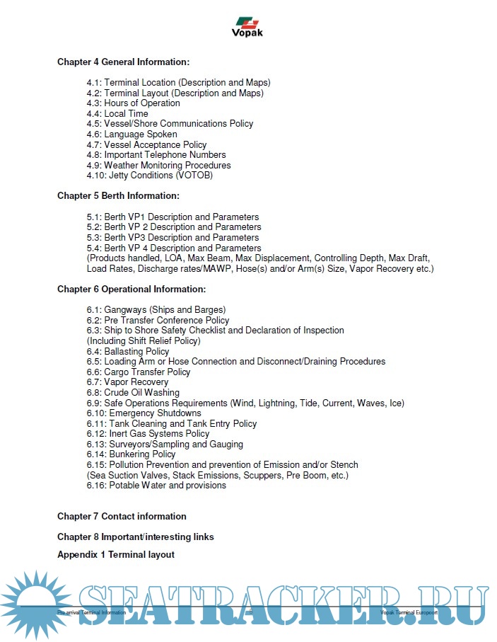 Year: 2019 Language: english Author: Vopak Genre: Handbook Format: PDF Quality: eBook Pages count: 62 Description: This Terminal information Manual is addressed to masters, owners, operators, and agents of all vessels calling at the Vopak Terminal in Rotterdam Europort designated on the front of the Manual. The master, owner and operator of the vessel calling at the Designated Terminal are responsible for: (a) the condition of the vessel, (b) the safe conduct of all operations on board the vessel, (c) compliance with all federal, state and local laws, rules and regulations, and (d) compliance with all rules and regulations in the Manual. Vessels are required to maintain copies of this Manual on board the vessel, with all notices and amendments fully accessible to all crewmembers, owner’s and operator’s personnel and/or appointed agents.