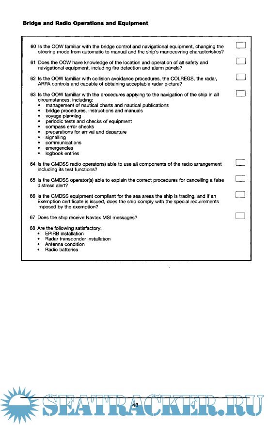 Year: 2000 Language: english Author: INTERCARGO Genre: Training courses Publisher: INTERCARGO Format: PDF Quality: eBook Pages count: 52 Description: This booklet explains: -The background to port State control. -How ships are chosen for inspection. -The inspection process. -Deficiencies and detentions. Although the booklet was written for ships in the dry bulk trade, the general information contained within it applies to all types of ship. Additional info: The Port State Control guide accompanies Videotel's Port State Control video (Not included in this post).