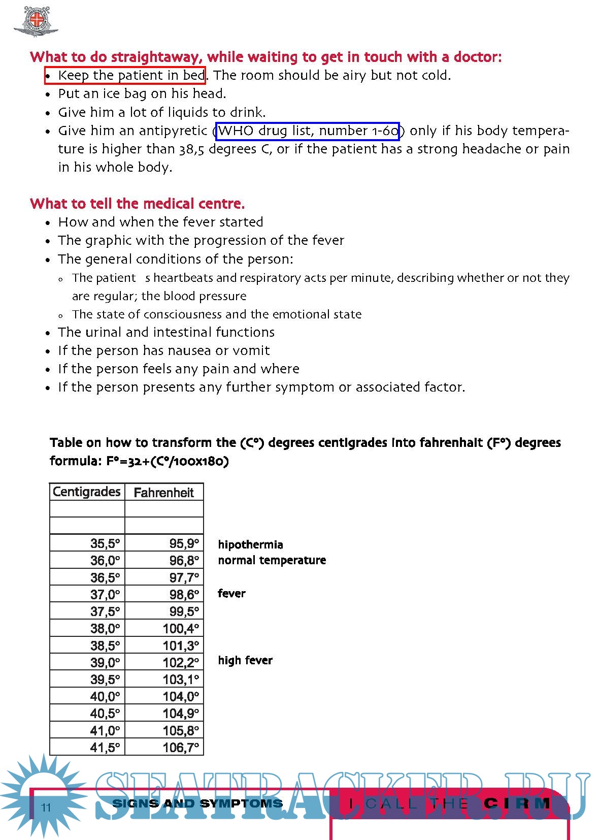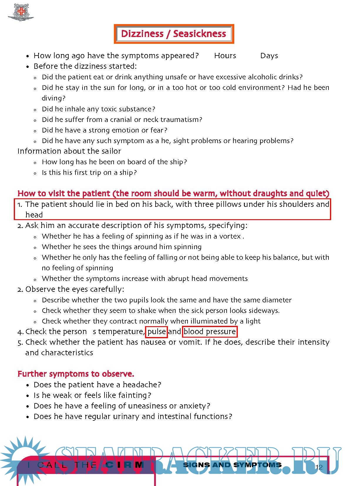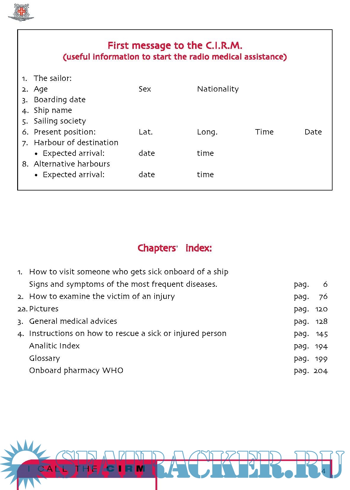 It is not a medical book at all, in fact technical words have been avoided. You will not find, in the index, the names of the diseases; there are no paragraphs about appendicitis , pneumonia , arm fracture and so on, but instead there is a list of the most common symptoms, such as fever , cough , or abdominal pain and a list of the most common types of injuries, such as traumatisms or intoxications . The experience of the CIRM teaches us that, onboard of a ship where there is no doctor, the best thing to do is examining carefully the starting symptoms of a disease or observing what type of accident has occurred, considering all the possibilities and intervening with caution so that the sick or injured person arrives to the harbour of destination in the best possible conditions.