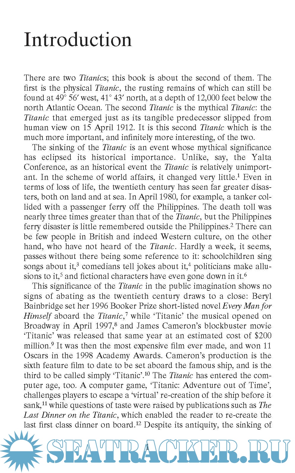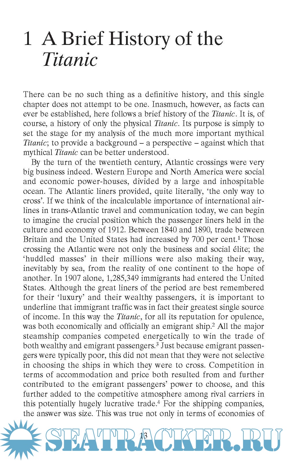 Year: 1999 Language: english Author: Richard Howells Genre: Handbook Publisher: MacMillan Press Ltd. ISBN: 0–333–72597–2 Format: PDF Quality: eBook Pages count: 226 Description: The first critical analysis of the Titanic as modern myth, this book focuses on the second of the two Titanics. The first was the physical Titanic, the rusting remains of which can still be found twelve thousand feet below the north Atlantic. The second is the mythical Titanic which emerged just as its tangible predecessor slipped from view on 15 April 1912. It is the second of the two Titanics which remains the more interesting and which continues to carry cultural resonances today. The Myth of the Titanic begins with the launching of the 'unsinkable ship' and ends with the outbreak of the 'war to end all wars'. It provides an insight into the particular culture of late-Edwardian Britain and beyond this draws far greater conclusions about the complex relationship between myth, history, popular culture and society as a whole.