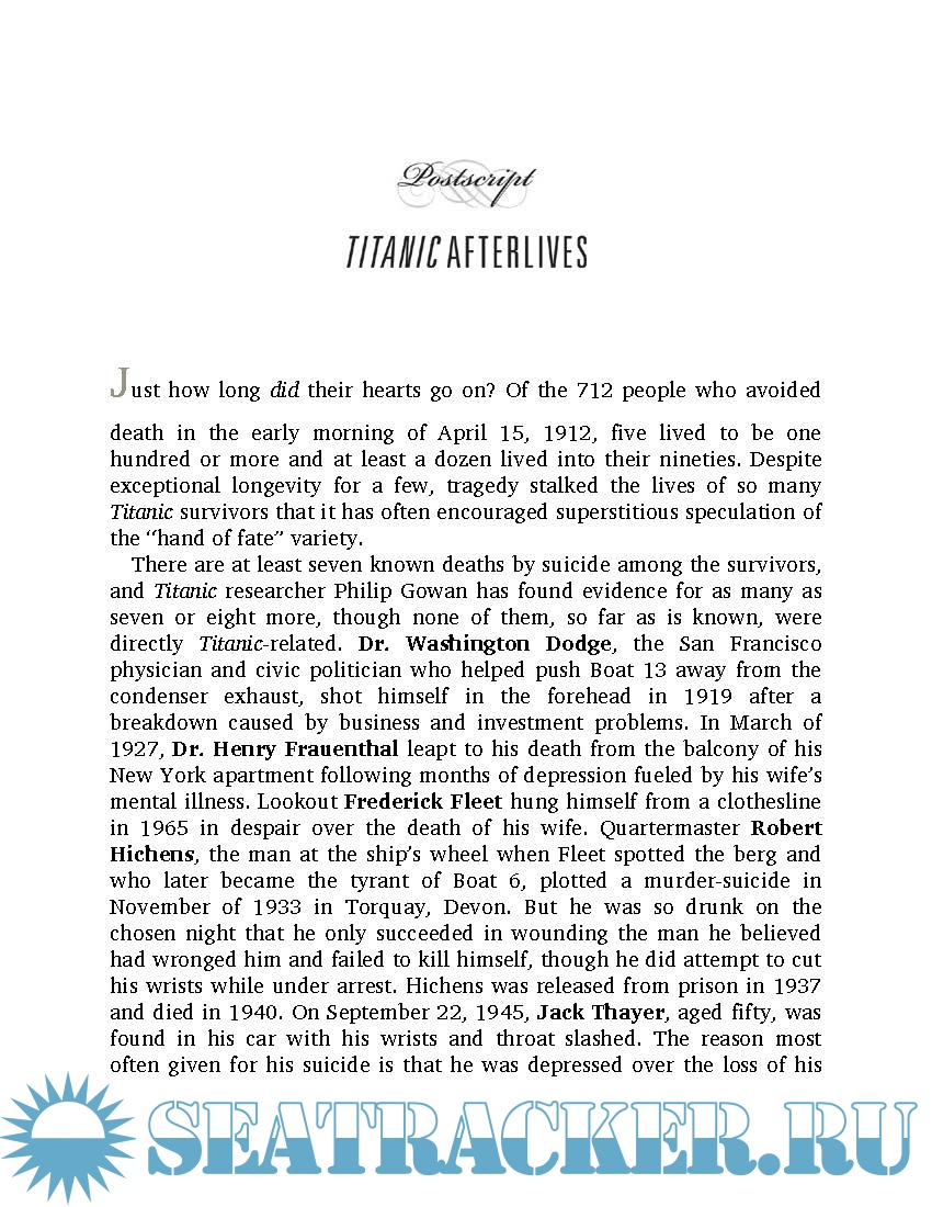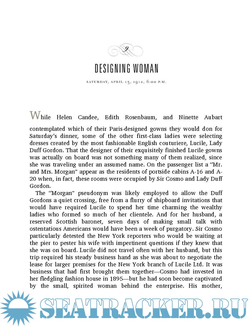 Year: 2012 Language: english Author: Hugh Brewster Publisher: Crown Publishers ISBN: 978-0-30798471-5 Format: PDF Quality: eBook Pages count: 355 Description: Gilded Lives, Fatal Voyage takes us behind the panelled doors of the Titanic’s elegant private suites to present compelling, memorable portraits of her most notable passengers. The Titanic has often been called “An exquisite microcosm of the Edwardian era,” but until now, her story has not been presented as such. In Gilded Lives, Fatal Voyage, historian Hugh Brewster seamlessly interweaves personal narratives of the lost liner’s most fascinating people with a haunting account of the fateful maiden crossing. Employing scrupulous research and featuring 100 rarely seen photographs, he accurately depicts the ship’s brief life and tragic denouement and presents compelling, memorable portraits of her most notable passengers: millionaires John Jacob Astor and Benjamin Guggenheim; President Taft's closest aide, Major Archibald Butt; writer Helen Churchill Candee; the artist Frank Millet; movie actress Dorothy Gibson; the celebrated couturiere Lady Duff Gordon; aristocrat Noelle, the Countess of Rothes; and a host of other travellers. Through them, we gain insight into the arts, politics, culture, and sexual mores of a world both distant and near to our own. And with them, we gather on the Titanic’s sloping deck on that cold, starlit night and observe their all-too-human reactions as the disaster unfolds. More than ever, we ask ourselves, “What would we have done?”