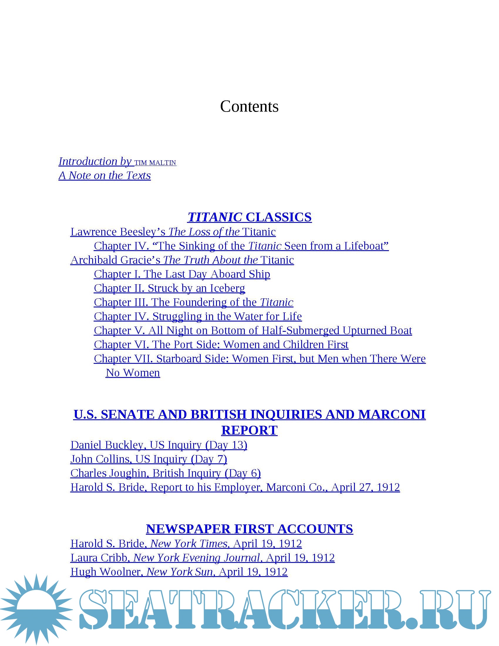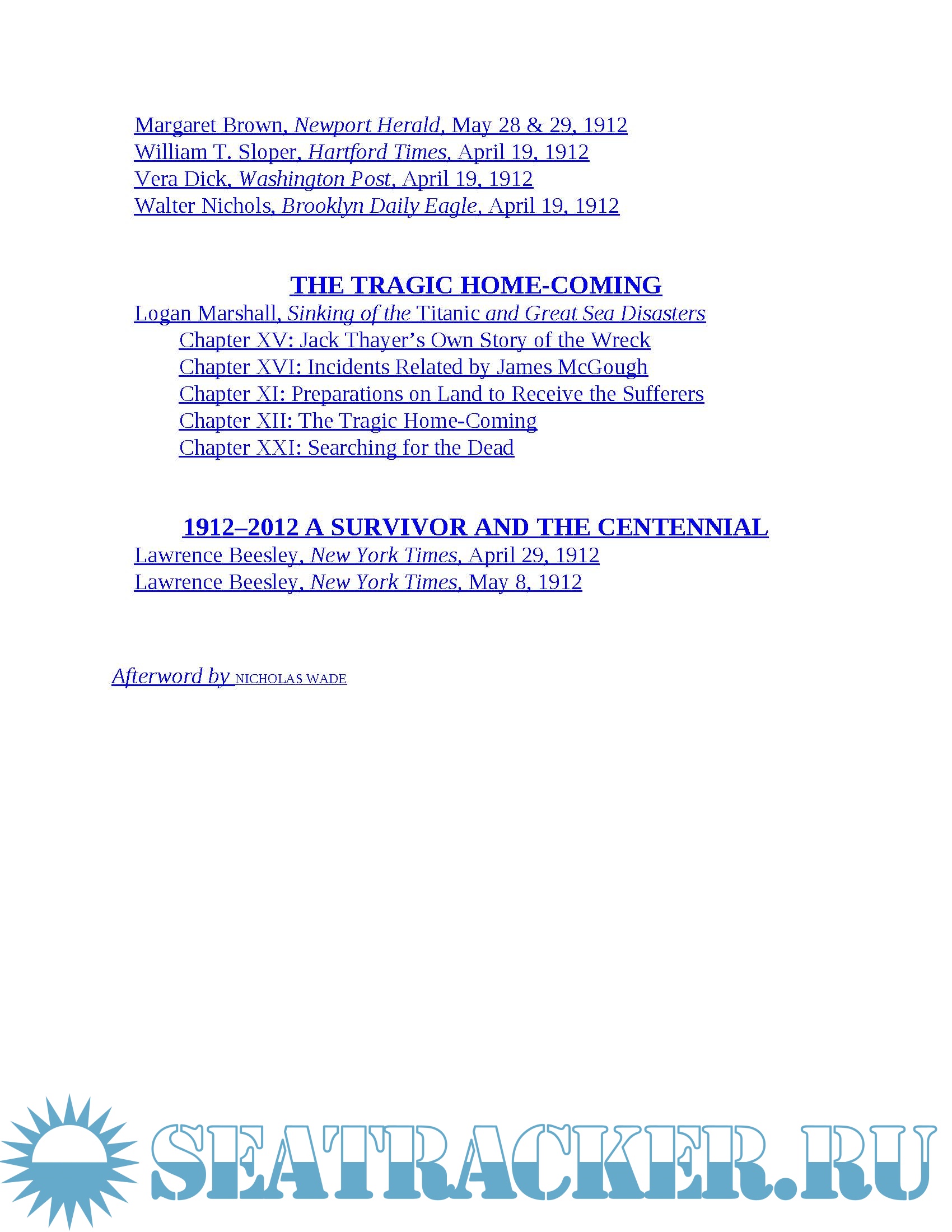 Year: 2012 Language: english Author: Various Genre: Handbook Publisher: Penguin Classics ISBN: 978-1-10158750-8 Format: PDF Quality: eBook Pages count: 317 Description: The Titanic, First Accounts graphic deluxe edition compiles first hand accounts, testimonies, and letters by notable Titanic survivors, including Archibald Gracie, Lawrence Beesley, Elizabeth W. Shutes, and the "unsinkable" Molly Brown. Full of historically accurate details and an afterword by the grandson of Lawrence Beesley, Titanic Survivors and author of The Loss of the S.S. Titanic, it will be the gift to give die-hard Titanic buffs. Authoritative, commemorative and in a striking, luxurious package with and introduction by Titanic enthusiast and expert, Tim Maltin, this will be the authoritative work on the disaster.