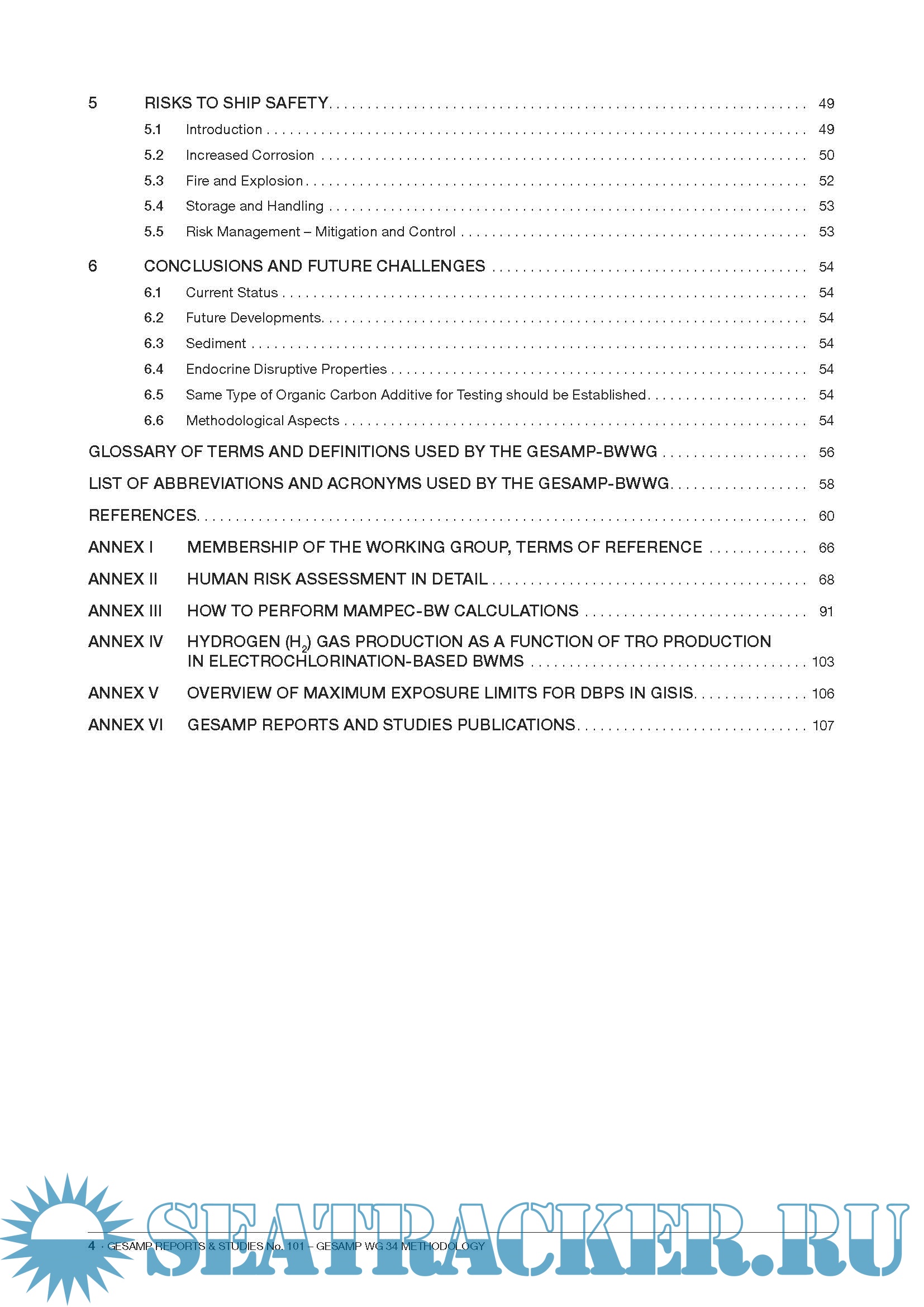 Description: The main intention of this report is to present the way of evaluation of BWMS as it has evolved during the last ten years. This methodology is based on internationally accepted methods of risk assessment as they are practised in several countries and regions worldwide. Methods and assumptions come from the World Health Organization (WHO), the Organization for Economic Co-operation and Development (OECD), the European Union, mainly the European Chemicals Agency (ECHA) for the evaluation of chemicals and biocides, the US Environmental Protection Agency (EPA), and are used in decision support systems in these organizations. The GESAMP-BWWG is accountable for its interpretation of these methods. Another aim of this publication is to present this risk assessment approach to the scientific community in order to evoke criticism and therefore improve the methodology. The evaluation of BWMS deserves a scientifically justifiable way to approve systems, thereby fulfilling the aim of protecting the environment, human health, property and resources.