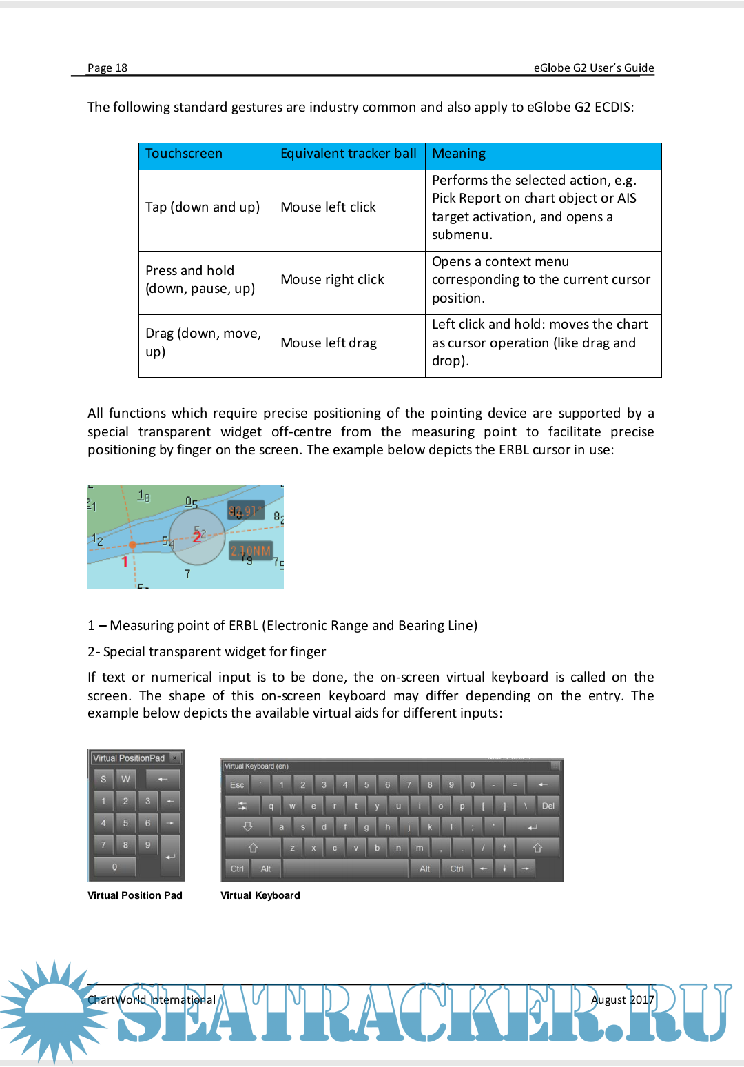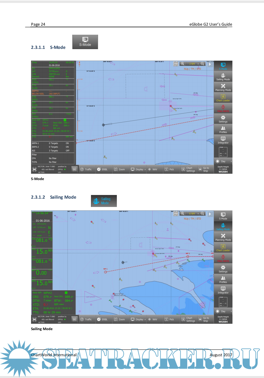 Year: 2017 Language: english Author: ChartWorld International Ltd Genre: Instruction Format: PDF Quality: eBook Number of pages: 256 Description:This User's Guide describes the use of the eGlobe G2 ECDIS. eGlobe G2 is designed to combine both an easily operated and multifunctional ECDIS as well as an overall coverage of services provided out of one hand. This includes charts, Kernel software, human-machine Interface, hardware, training, consultancy and customer support. Most important, eGlobe G2 complies with the latest standards for ECDIS operation and offers the crew on board a high level of flexibility due to multi-functional route management. eGlobe G2 works with different combinations of hardware. This can be either a touchscreen unit, or non-touchscreen in combination with a hardware keyboard (incl. trackball). The operational geographical area of eGlobe G2 is not limited from 85° N to 85° S. Due to an automatic change from Mercator to stereographic projection eGlobe G2 can also be operated in latitudes higher than 85°. The documentation corresponds to the respective software version. Nevertheless, occasionally the software may differ from the functionality described due to technical reasons Revision 2.0.0 / Software Version 2.0.x