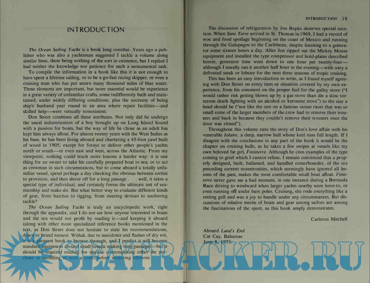 Year: 1973 Language: english Author: Donald M. Street Genre: Reference book Publisher: W. W. Norton & Co Edition: First ISBN: B01FELTGDQ Format: PDF Quality: Scanned pages Pages count: 712 Description: Donald Street is one of the pioneers of modern ocean cruising and this book and the accompanying Volume II offer a lot of information about (mostly) wooden sailboats that can be applied to fiberglass sailboats. Outfitting and yacht design for blue water sailing.