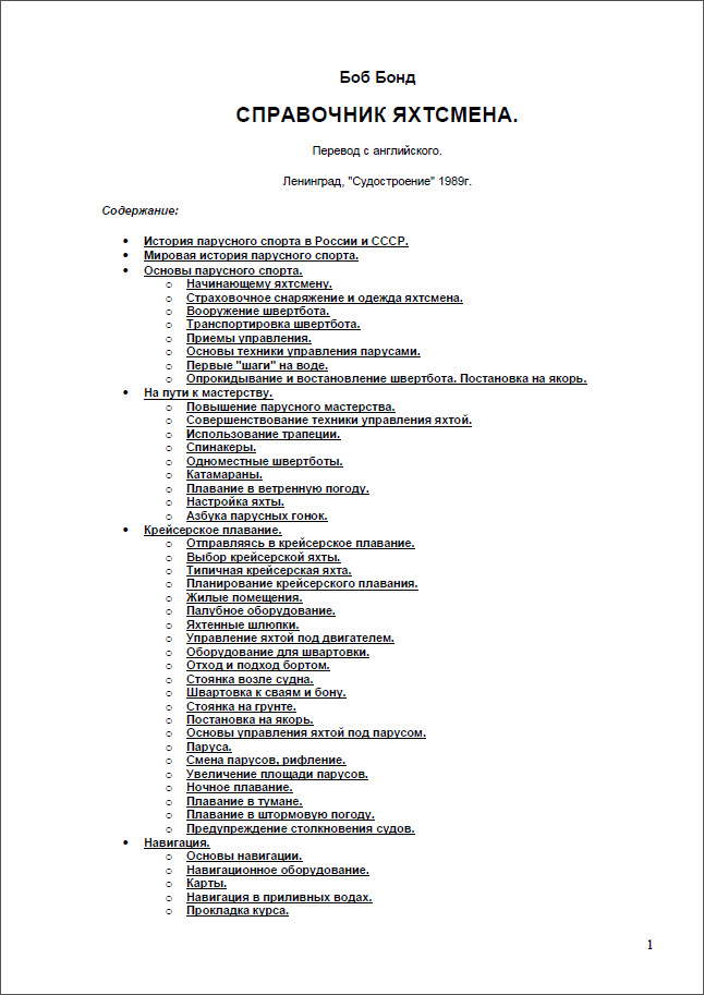 СПРАВОЧНИК ЯХТСМЕНА Год выпуска: 1989 Язык: русский Автор: Боб Бонд Жанр: Справочник Издательство: Ленинград, "Судостроение" Формат: PDF Качество: OCR без ошибок Количество страниц: 352 Описание: Предлагаемая книга заметно отличается от привычных справочников - большая информативная нагрузка приходится на иллюстрации, которые при подготовке к публикации перевода издательство старалось воспроизвести, по возможности, в том же виде, как и в английском оригинале. Уверены, что читателями "Справочника" будут не только начинающие яхтсмены, но и достаточно искушенные в парусном спорте люди. Возможно, что последним изложение отдельных вопросов покажется слишком упрощенным, отличающимся от принятой у нас практики. Однако мы не считали необходимым перерабатывать текст и иллюстрации книги: ведь Боб Бонд не ставит перед собой задачу глубокого раскрытия темы, а лишь знакомит интересующихся со всем многообразием современного парусного спорта. Единственное, чем мы позволили дополнить русское издание, - это кратко рассказать о парусном спорте в СССР, который имеет свою историю и специфику развития. Каждый, кто, как и я, рожден в семье моряков, с детства проникается пониманием красоты моря и уважением к его силе. Но начинающим плавать под парусом этому уважению еще предстоит научиться, пройдя иногда через суровые испытания. Теперь все больше людей обучается плаванию под парусом, стремясь испытать огромную радость и чувство свободы, которые оно доставляет. Начинающие яхтсмены не обладают опытом и нуждаются в руководстве и советах общего характера, дающих разносторонние практические знания. Именно этой категории яхтсменов и адресована в первую очередь книга. Парусный спорт охватывает различные виды плавания под парусами - от прибрежных прогулок на маленьких парусных лодках до кругосветных яхтенных гонок. Люди разного возраста получают настоящее удовольствие от плавания под парусами. Занимаясь разработкой программ обучения яхтсменов, принятых уже во всем мире, я пришел к выводу, что книга, в доступном виде излагающая отдельные разделы этого технически сложного вида спорта, крайне необходима. Парусный спорт - это некий визуальный опыт, на изучение которого тратится много времени, при этом основные вопросы разъясняются с помощью слов, жестов или рисунков. Поэтому задача книги состоит в том, чтобы, используя иллюстрации и пояснения к ним, помочь начинающим яхтсменам усвоить основные принципы плавания под парусом. Я надеюсь, что читатель сможет найти в ней ответы на те вопросы, которые чаще всего задаются, а также на те, которые из-за боязни насмешки или неудобства иногда не задаются, но являются существенными для истинного понимания предмета. Я хотел бы, чтобы справочник стал той самой книгой, которую капитан предлагает своим гостям или команде, прежде чем выйти с ними в море. Не желая ограничивать свободу, к которой стремятся при плавании под парусами, я постарался сделать акцент в этой книге на должном отношении к безопасности плавания лодки и экипажа. Одна из опасностей этого вида спорта заключается в том, что начинающие яхтсмены не осознают недостатка своего опыта. Их чрезмерное благодушие или уверенность в себе, отсутствие достаточных знаний и опыта могут привести к аварии или даже трагедии. Знакомя начинающих яхтсменов с основным объе