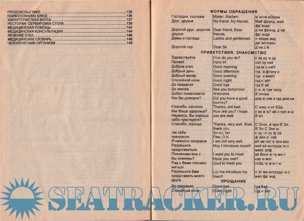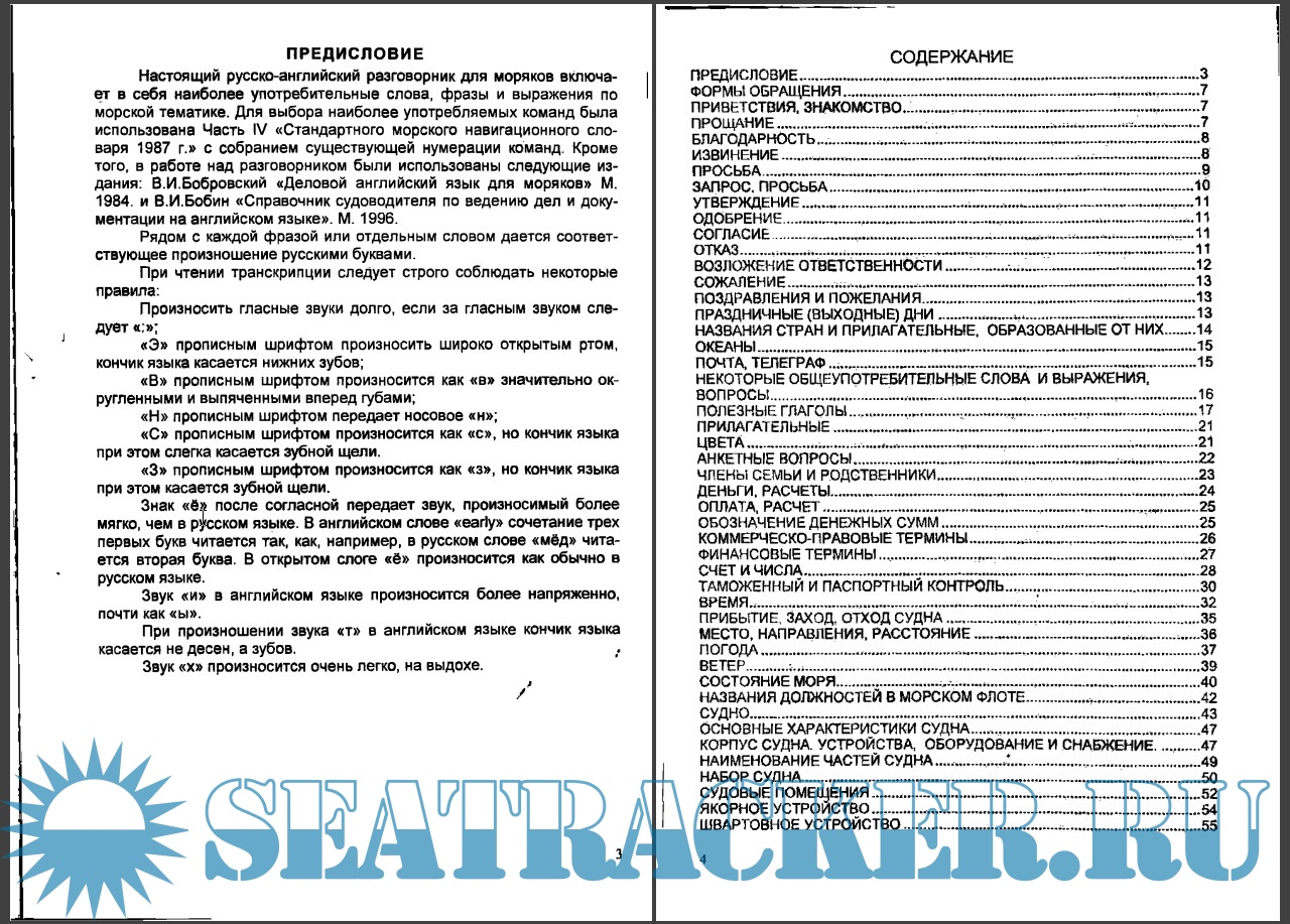 ПРЕДИСЛОВИЕ.....................................................................................................3 ФОРМЫ ОБРАЩЕНИЯ..........................................................................................7 ПРИВЕТСТВИЯ, ЗНАКОМСТВО...........................................................................7 ПРОЩАНИЕ.........................................................................................-■.................7 БЛАГОДАРНОСТЬ.................................................................................................8 ИЗВИНЕНИЕ..........................................................................................................а ПРОСЬБА...............................................................................................................9 ЗАПРОС, ПРОСЬБА............................................................................................10 УТВЕРЖДЕНИЕ...................................................................................................11 ОДОБРЕНИЕ........................................................................................................11 СОГЛАСИЕ..........................................................................................................11 ОТКАЗ...................................................................................................................11 ВОЗЛОЖЕНИЕ ОТВЕТСТВЕННОСТИ...............................................................12 СОЖАЛЕНИЕ.......................................................................................................13 ПОЗДРАВЛЕНИЯ И ПОЖЕЛАНИЯ.....................................................................13 ПРАЗДНИЧНЫЕ (ВЫХОДНЫЕ) ДНИ.................................................................13 НАЗВАНИЯ СТРАН И ПРИЛАГАТЕЛЬНЫЕ, ОБРАЗОВАННЫЕ ОТ НИХ........14 ОКЕАНЫ...............................................................................................................15 ПОЧТА, ТЕЛЕГРАФ.............................................................................................15 НЕКОТОРЫЕ ОБЩЕУПОТРЕБИТЕЛЬНЫЕ СЛОВА И ВЫРАЖЕНИЯ, ВОПРОСЫ............................................................................................................16 ПОЛЕЗНЫЕ ГЛАГОЛЫ........................................................................................17 ПРИЛАГАТЕЛЬНЫЕ...........................................................................................21 ЦВЕТА..................................................................................................................21 АНКЕТНЫЕ ВОПРОСЫ.......................................................................................22 ЧЛЕНЫ СЕМЬИ И РОДСТВЕННИКИ..................................................................23 ДЕНЬГИ, РАСЧЕТЫ.............................................................................................24 ОПЛАТА, РАСЧЕТ...............................................................................................25 ОБОЗНАЧЕНИЕ ДЕНЕЖНЫХ СУММ.................................................................25 КОММЕРЧЕСКО-ПРАВОВЫЕ ТЕРМИНЫ..........................................................26 ФИНАНСОВЫЕ ТЕРМИНЫ.................................................................................27 СЧЕТ И ЧИСЛА....................................................................................................28 ТАМОЖЕННЫЙ И ПАСПОРТНЫЙ КОНТРОЛЬ.................................................30 ВРЕМЯ..................................................................................................................32 ПРИБЫТИЕ, ЗАХОД, ОТХОД СУДНА ................................................................35 МЕСТО, НАПРАВЛЕНИЯ, РАССТОЯНИЕ.........................................................36 ПОГОДА...............................................................................................................37 ВЕТЕР...................................................................................................................39 СОСТОЯНИЕ МОРЯ............................................................................................40 НАЗВАНИЯ ДОЛЖНОСТЕЙ В МОРСКОМ ФЛОТЕ............................................42 СУДНО..................................................................................................................43 ОСНОВНЫЕ ХАРАКТЕРИСТИКИ СУДНА..........................................................47 КОРПУС СУДНА УСТРОЙСТВА, ОБОРУДОВАНИЕ И СНАБЖЕНИЕ...........47 НАИМЕНОВАНИЕ ЧАСТЕЙ СУДНА..................!................................................49 НАБОР СУДНА.....................................................................................................50 СУДОВЫЕ ПОМЕЩЕНИЯ...................................................................................52 ЯКОРНОЕ УСТРОЙСТВО...................................................................................54 ШВАРТОВНОЕ УСТРОЙСТВО...........................................................................55 ГРУЗОПОДЪЕМНОЕ УСТРОЙСТВО..................................................................57 ТАКЕЛАЖНЫЕ РАБОТЫ...................................................
