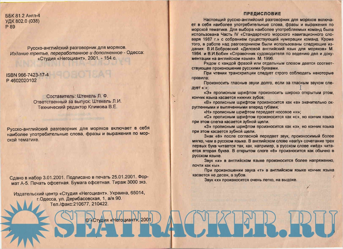 Русско-английский разговорник для моряков / Russian-English Phrasebook for Sailors Год выпуска: 2001 Язык: русский, английский Автор: Штекель Л. Ф. Жанр: Разговорник Издательство: “Студия “НЕГОЦИАНТ ОДЕССА ISBN: 966-7423-17-4 Р4602020102 Формат: PDF/DJVU + MP3 Качество: Отсканированные страницы Количество страниц: 154 Описание: Настоящий русско-английский разговорник для моряков включает в себя наиболее употребительные слова, фразы и выражения по морской тематике. Для выбора наиболее употребляемых команд была использована Часть IV «Стандартного морского навигационного словаря 1987 г.» с собранием существующей нумерации команд. Кроме того, в работе над разговорником были использованы следующие издания: В.И.Бобровский «Деловой английский язык для моряков» М. 1984. и В.И.Бобин «Справочник судоводителя по ведению дел и документации на английском языке». М. 1996. Рядом с каждой фразой или отдельным словом дается соответствующее произношение русскими буквами. При чтении транскрипции следует строго соблюдать некоторые правила: Произносить гласные звуки долго, если за гласным звуком следует «:»; «Э» прописным шрифтом произносить широко открытым ртом, кончик языка касается нижних зубов; «В» прописным шрифтом произносится как «в» значительно округленными и выпяченными вперед губами; «Н» прописным шрифтом передает носовое «н»; «С» прописным шрифтом произносится как «с», но кончик языка при этом слегка касается зубной щели. «3» прописным шрифтом произносится как «з», но кончик языка при этом касается зубной щели. Знак «ё» после согласной передает звук, произносимый более мягко, чем в русском языке. В английском слове «early» сочетание трех первых букв читается так, как, например, в русском слове «мёд» читается вторая буква. В открытом слоге «ё» произносится как обычно в русском языке. Звук «и» в английском языке произносится более напряженно, почти как «ы». При произношении звука «т» в английском языке кончик языка касается не десен, а зубов. Звук «х» произносится очень легко, на выдохе.