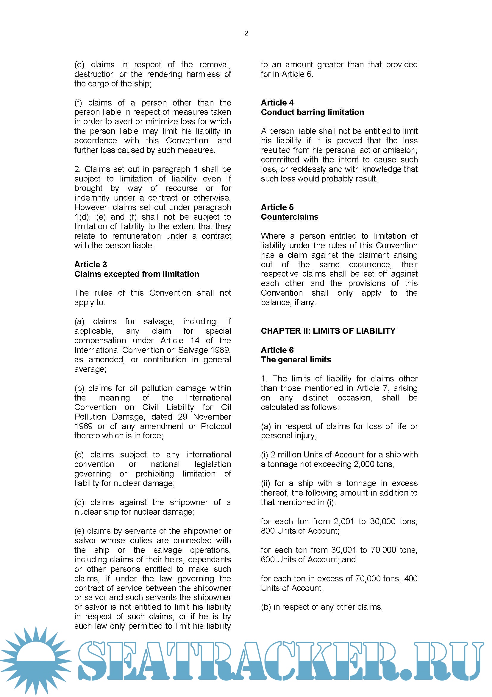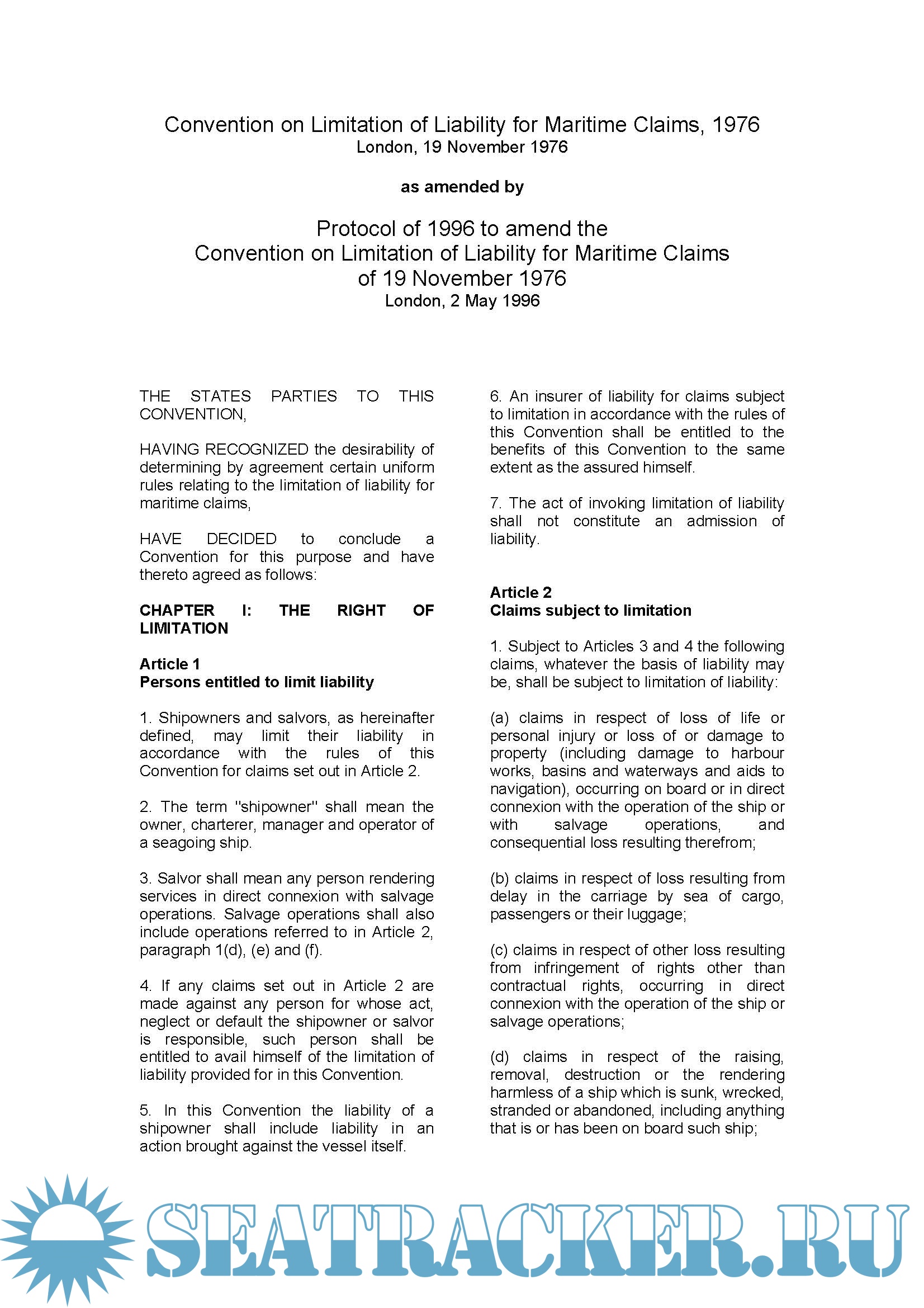 Page : 1 CHAPTER I : Article 1: Persons entitled to limit liability, Article 2: Claims subject to limitation,