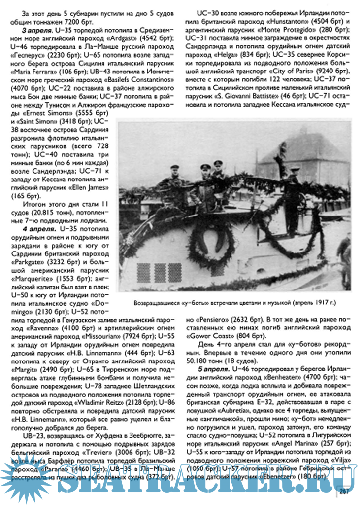 Кроме того, книга содержит подробное описание боевых действий подводных лодок обеих враждебных группировок в морях вокруг Европы. Рассказывая о Мировой войне на море, особое внимание автор уделяет изложению и анализу событий, связанных с тотальным подводным наступлением германского подводного флота на коммерческое судоходство, а также с борьбой союзников против `y - ботов`.