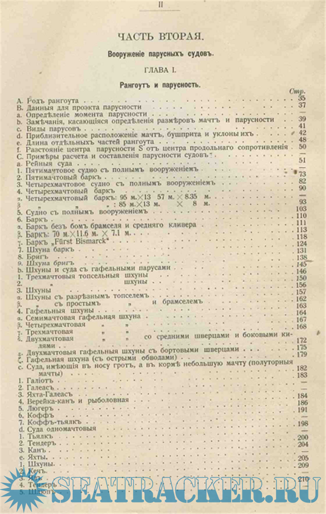 Во второй и третьей частях ее представлены, как чертежи, так и расчеты разных типов судов, (именно: водоизмещения, положений центра величины, метацентра и др.) их деталей рангоута и парусности.