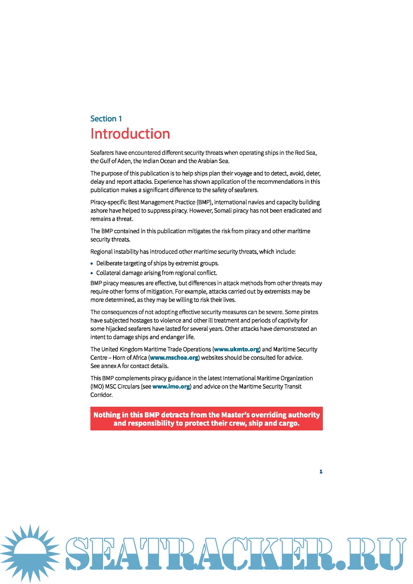 Seafarers have encountered different security threats when operating ships in the Red Sea, the Gulf of Aden, the Indian Ocean and the Arabian Sea. The purpose of this publication is to help ships plan their voyage and to detect, avoid, deter, delay and report attacks. Experience has shown application of the recommendations in this publication makes a significant difference to the safety of seafarers. Piracy-specific Best Management Practice (BMP), international navies and capacity building ashore have helped to suppress piracy. However, Somali piracy has not been eradicated and remains a threat.