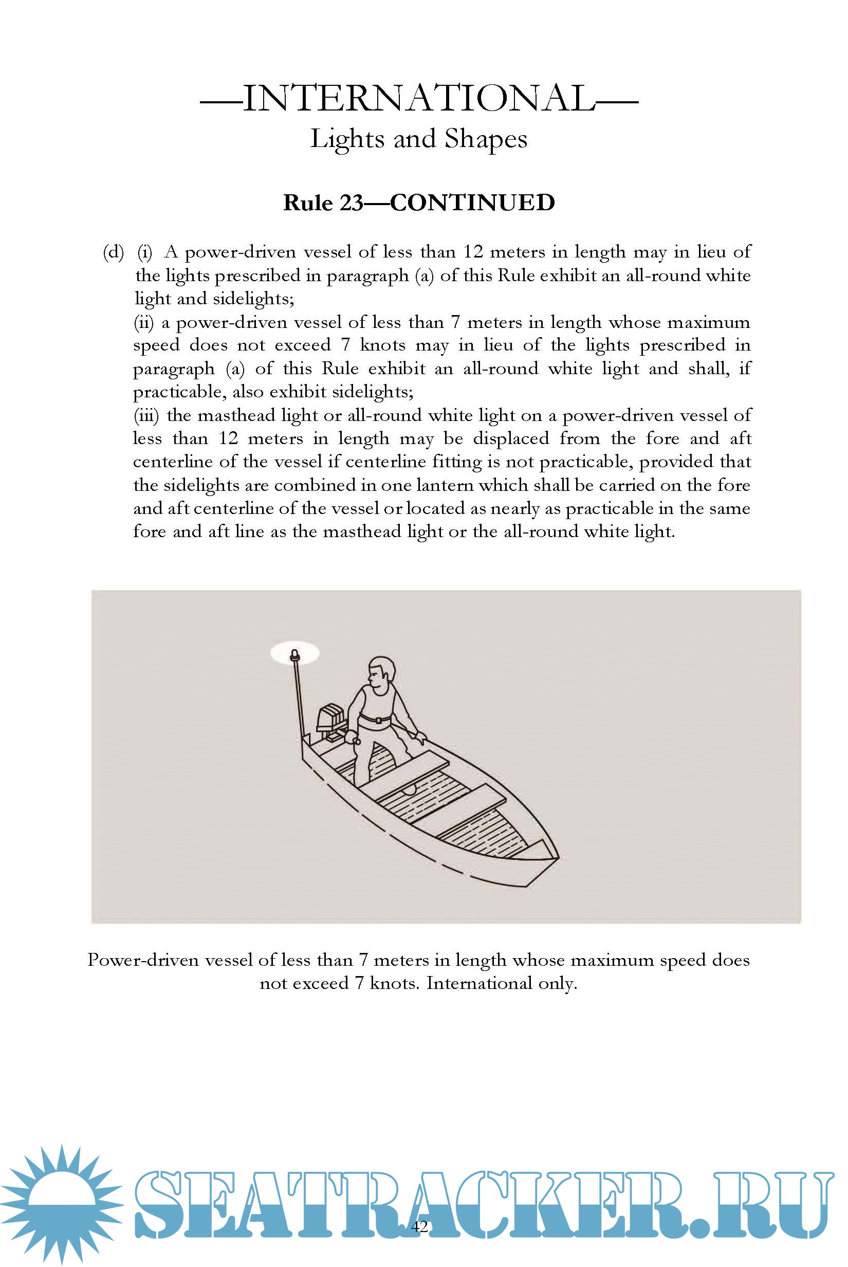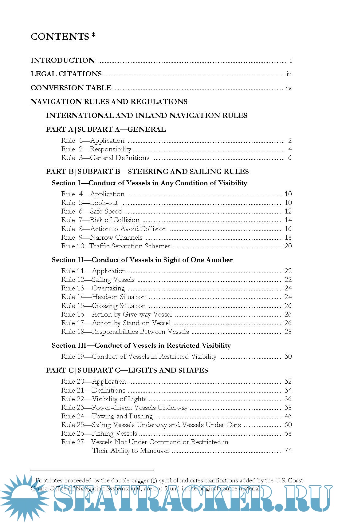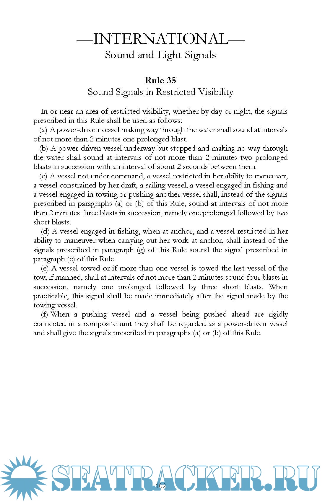 Description: The International Rules in this book were formalized in the Convention on the International Regulations for Preventing Collisions at Sea, 1972, and became effective on July 15, 1977. The Rules (commonly called 72 COLREGS) are part of the Convention, and vessels flying the flags of states ratifying the treaty are bound to the Rules. The United States has ratified this treaty and all United States