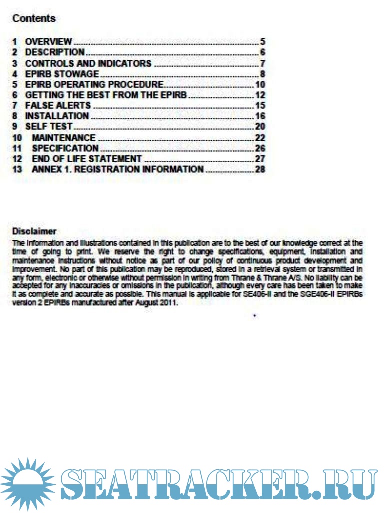 Year: 2011 Language: english Author: Thrane & Thrane Genre: Manual Publisher: Thrane & Thrane Edition: 1st ISBN: 82-1073-002 Format: PDF Quality: eBook Pages count: 36 Description: This Emergency Position Indicating Radio Beacon (EPIRB) is intended for carriage on SOLAS and non-SOLAS vessels. When carrying an EPIRB on board you enjoy the reassurance of a last resort safeguard against any life threatening incidents that may occur anywhere in the world. Only operate the EPIRB in situations of grave and imminent danger to life. False alerts endanger lives. Help prevent them by understanding how to look after the EPIRB. Cospas Sarsat system EPIRBs transmit a unique emergency message identifier via the Cospas-Sarsat satellite system which can determine your location anywhere on the earth’s surface. In most cases the first emergency alert is received within 5 minutes of activation, depending on satellite coverage at the time this can sometimes extend to around 45 minutes. When the emergency alert message is received at a Rescue Co-ordination Centre (RCC) it is cross referenced by the Unique Identifier Number (UIN) against user registration information. Details of the alert will be forwarded to the appropriate local Search and Rescue (SAR) teams. Keeping your vessels registration details up to date is critical to ensuring a quick SAR response. If you have purchased the GPS version, it has a built-in GPS receiver which can reduce the time for Search and Rescue teams to arrive on scene, as your precise coordinates are transmitted within the first few minutes. Non-GPS versions are pinpointed using Doppler Shift from the over-flying satellites. EPIRBs have a secondary or ‘homing’ transmitter which allows SAR teams to direction find or ‘home in’ on the EPIRB once they arrive on the scene. Once activated the EPIRB will continue to transmit emergency alerts for a minimum of 48 hours.