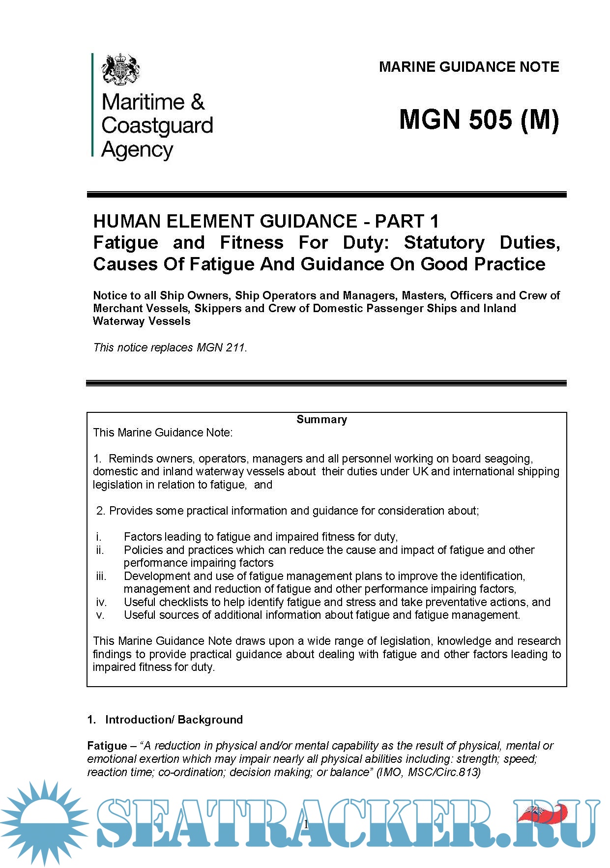 1. Human Element Guidance Part 1, MGN 505 (25 pages), Published 31 March 2014 - Last updated 6 January 2017 2. Human Element Guidance Part 2, MGN 520 (17 pages), Published 5 January 2017