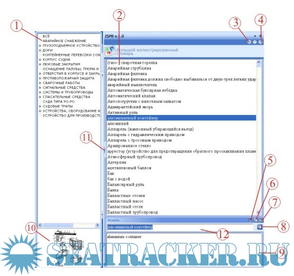 (2)-Окно списка слов и выражений, при выборе словае или выражения из списка, его перевод можно увидеть в окне(9) и иллюстрации относящиеся к этому слову в окне (10).