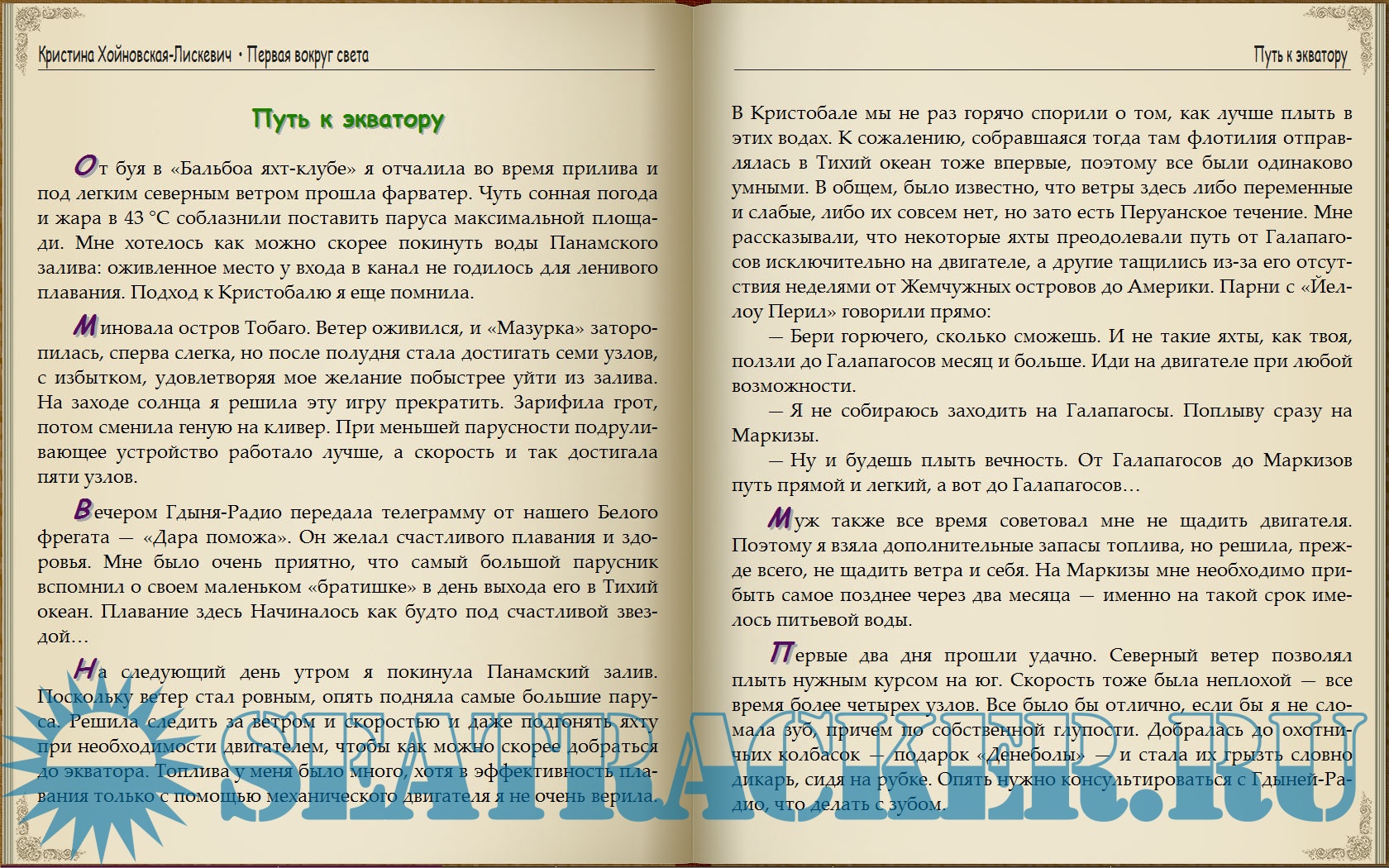 Описание: Автор книги — польская яхтсменка и инженер-судостроитель Кристина Хойновская-Лискевич — первая в мире женщина, которая совершила кругосветное плавание в одиночку на небольшой яхте «Мазурка». Плавание длилось два года, его и описывает в своей книге автор живо, увлекательно, с мягким юмором.
