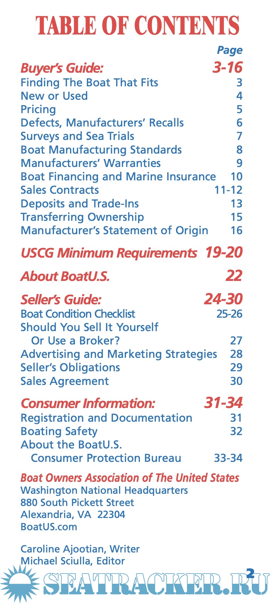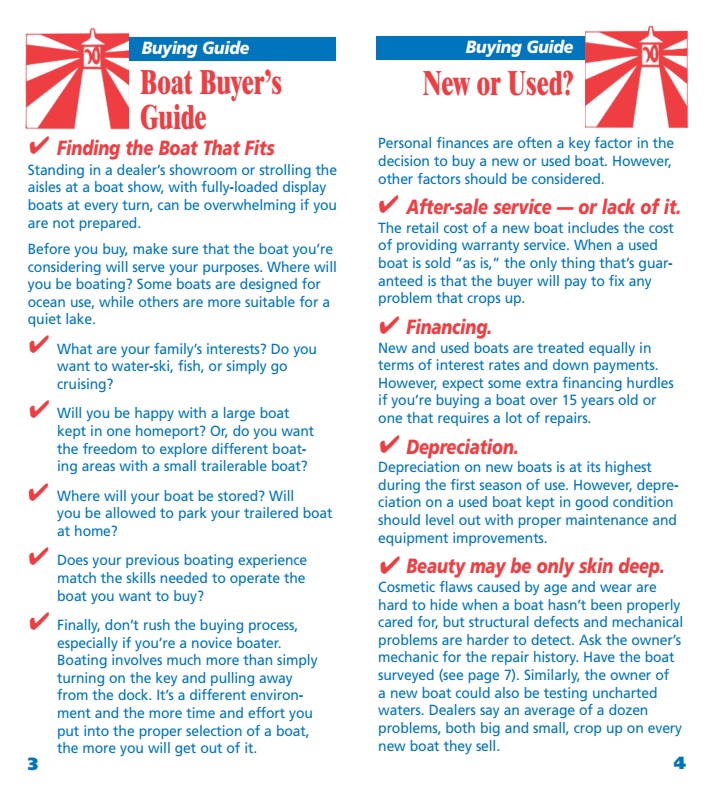 The BoatU.S. Guide To Buying and Selling A Boat... will help the novice navigate unfamiliar waters and remind the seasoned boat owner of landmarks to steer by and shoals to avoid when “trading up” or selling. In the Guide, you will find sources for information about defects and recalls, advice on working with dealers, brokers and manufacturers, pointers for writing consumer-friendly sales contracts — and lots more.