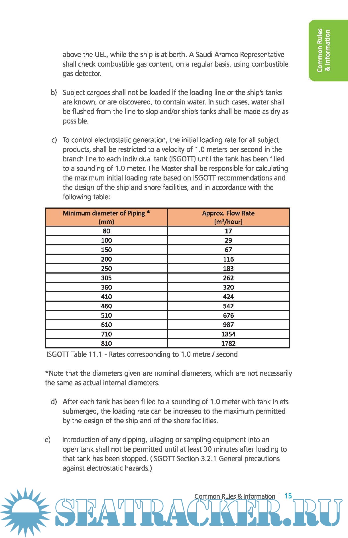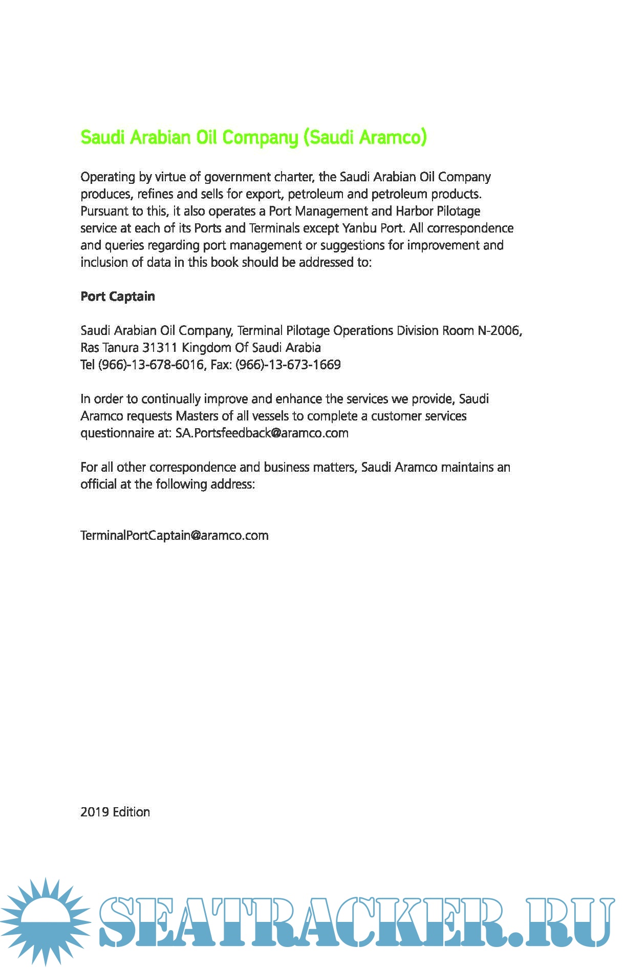 Description: This book is designed as a reference work for the purpose of acquainting Owners, Charterers, Masters of vessels and others with the general conditions, rules, regulations, facilities and available services at all Saudi Aramco Terminals. Every vessel which arrives at any Saudi Aramco Port or Terminal must have a copy of this book on board which is obtainable through the vessel’s agent. Every Master wishing to berth at any Saudi Aramco port or terminal must contract to comply with all the rules and regulations contained herein.This book does not replace or modify official publications covering the waters, areas, hazards or other subjects to which it pertains, nor is it intended for such purposes. The information contained herein is believed to be accurate at the time of going to press but Saudi Aramco makes no warranties and assumes no responsibilities regarding this book or any other information which may appear in supplemental publications, additions or corrections supplied by Saudi Aramco.