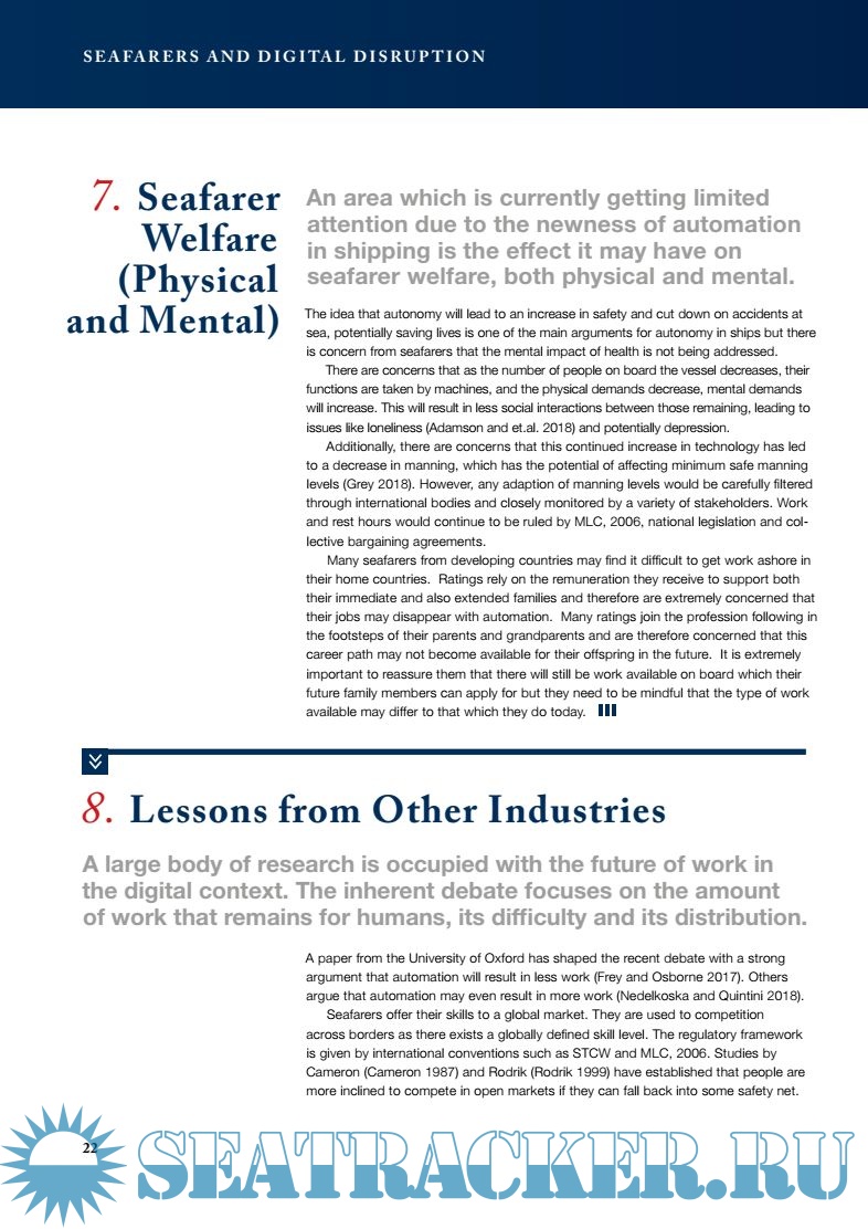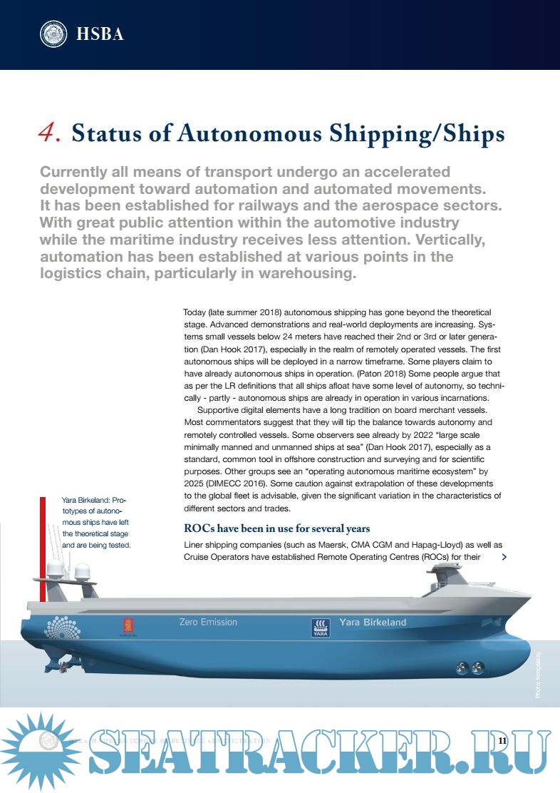 Year: 2018 Language: english Author: HSBA Publisher: HSBA Format: PDF Quality: eBook Pages count: 32 Description: This paper will focus on potential social and practical consequences of autonomous shipping and digitalization on seafarers. This Hamburg School of Business Administration paper was commissioned by the ICS Labour Affairs Committee to identify and highlight issues which may have consequences for seafarers as a result of possible digital disruption onboard ships. It will also serve as a basis for further discussions, research and strategy building. The goal is to define essential developments in line with other bodies of ICS.
